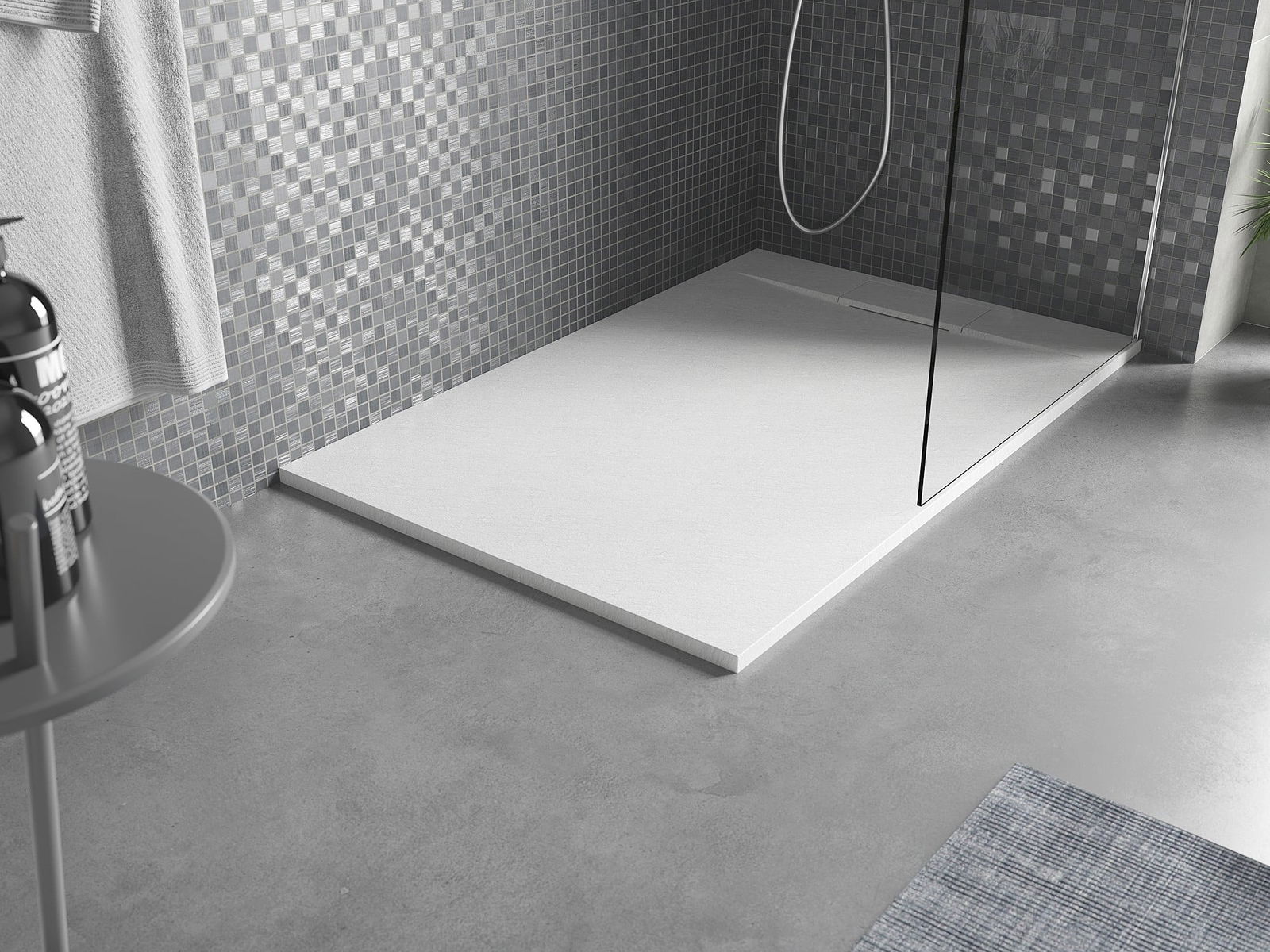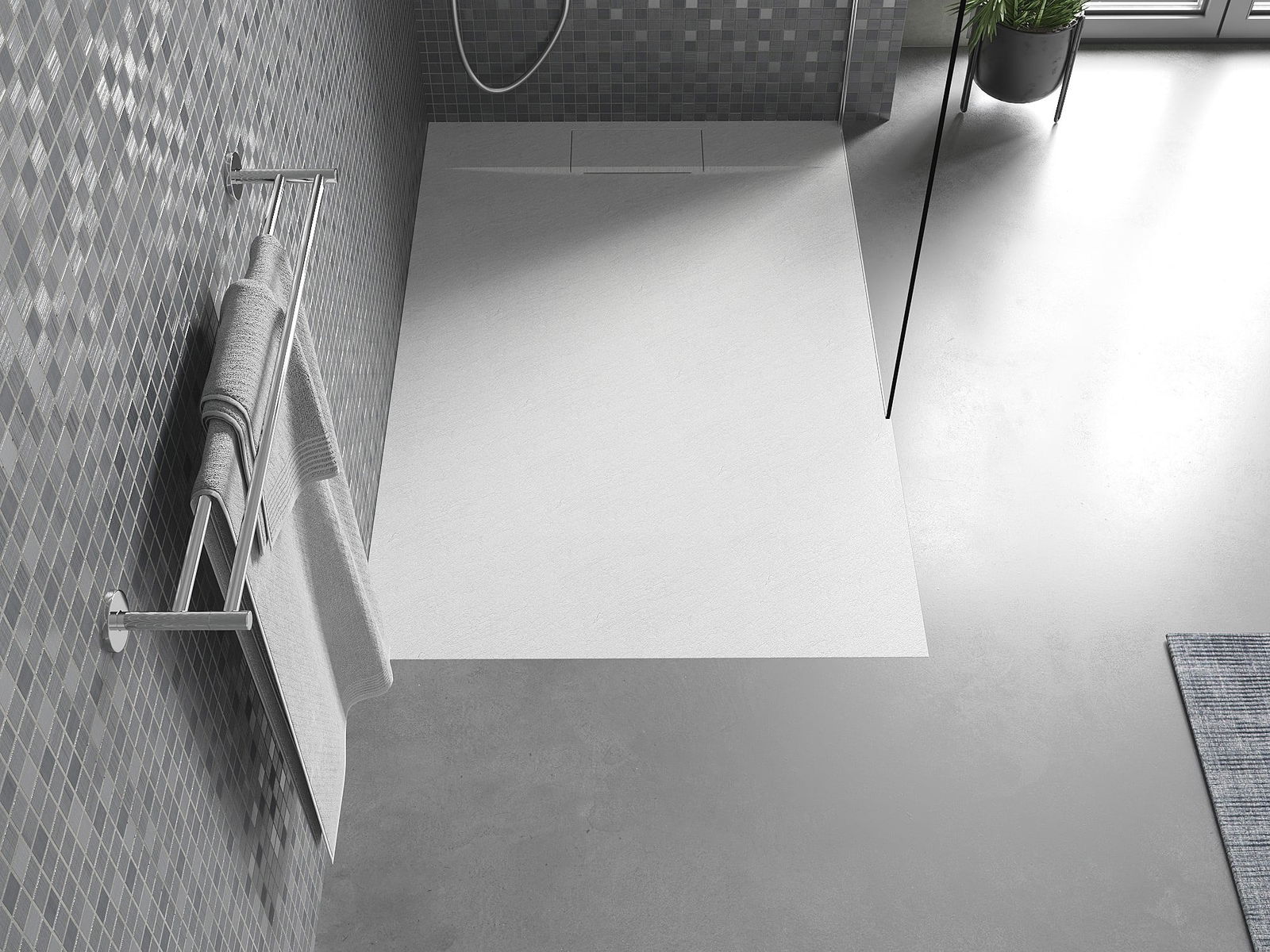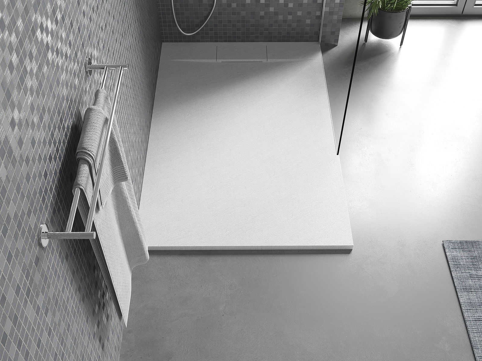 La surface du receveur de douche rappelle par sa structure la pierre. Elle constitue une combinaison exceptionnelle d'un aspect naturel et d'un aménagement intérieur moderne. Elle ajoute du caractère, souligne l'esthétique et l'élégance de la décoration de la salle de bains et séduit par sa forme.
