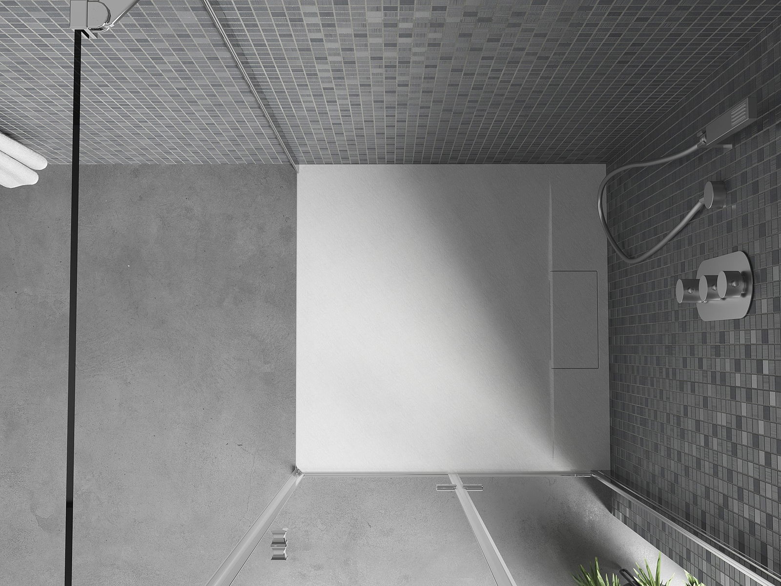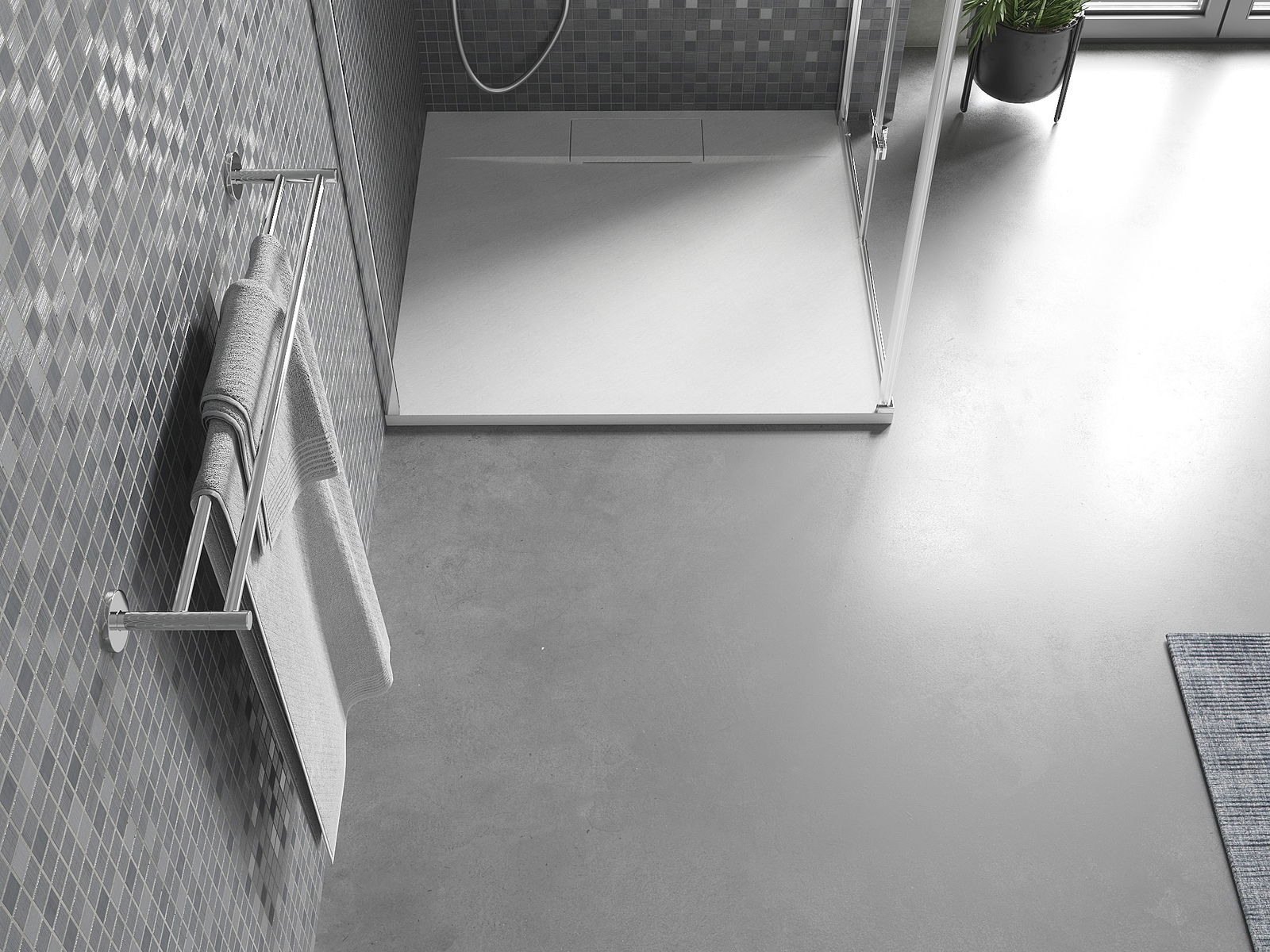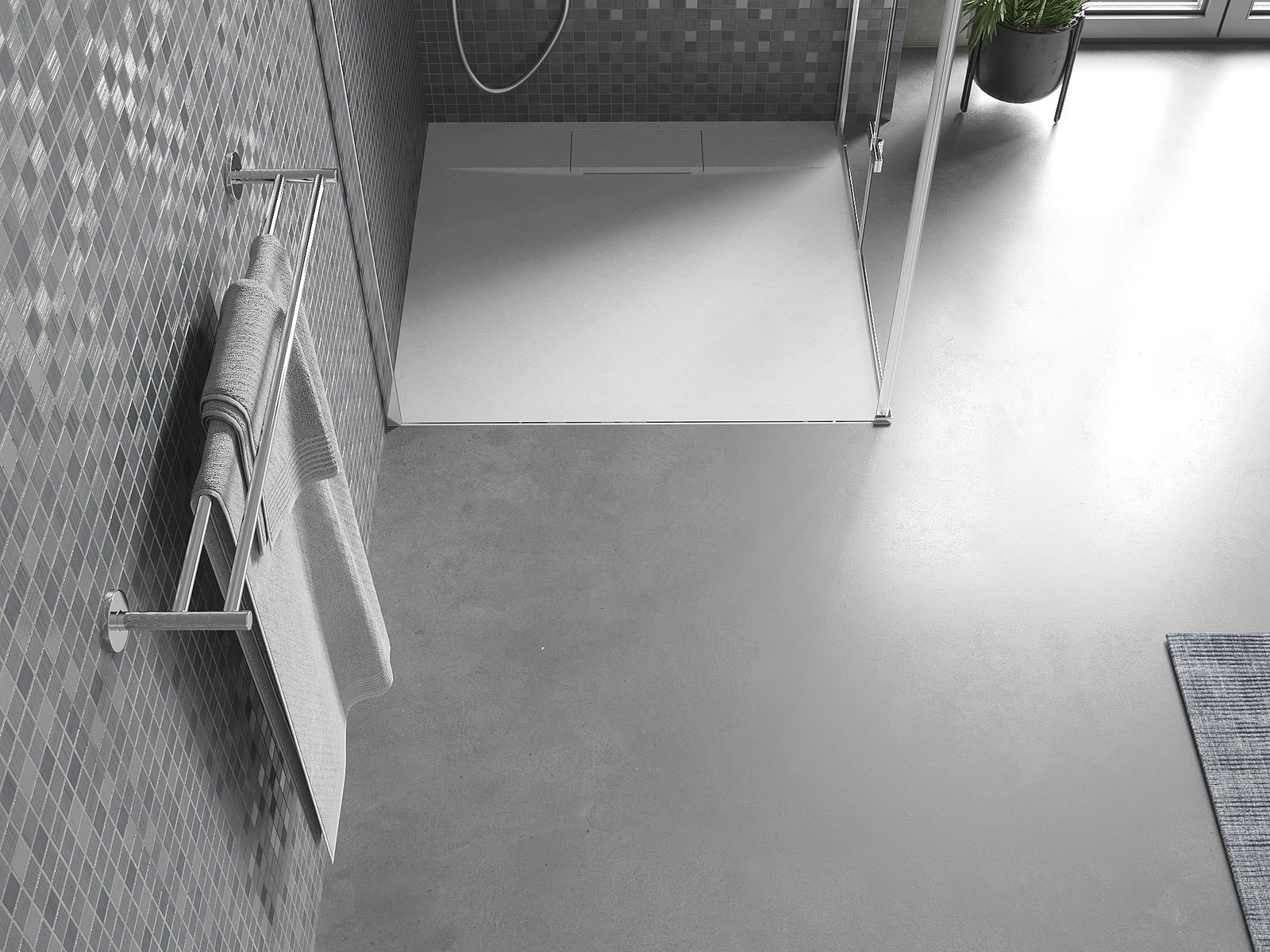 La surface du receveur de douche rappelle par sa structure la pierre. Elle constitue une combinaison exceptionnelle d'un aspect naturel et d'un aménagement intérieur moderne. Elle ajoute du caractère, souligne l'esthétique et l'élégance de la décoration de la salle de bains et séduit par sa forme.