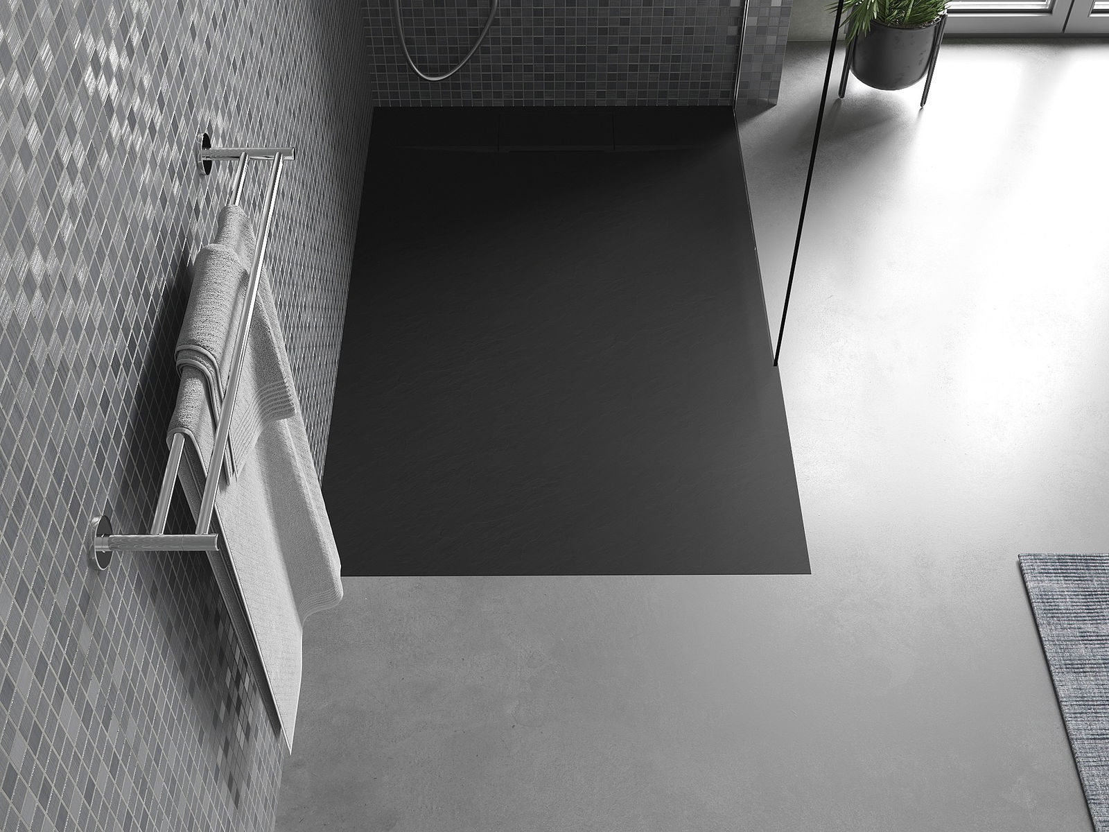 La surface du receveur de douche rappelle par sa structure la pierre. Elle constitue une combinaison exceptionnelle d'un aspect naturel et d'un aménagement intérieur moderne. Elle ajoute du caractère, souligne l'esthétique et l'élégance de la décoration de la salle de bains et séduit par sa forme.
