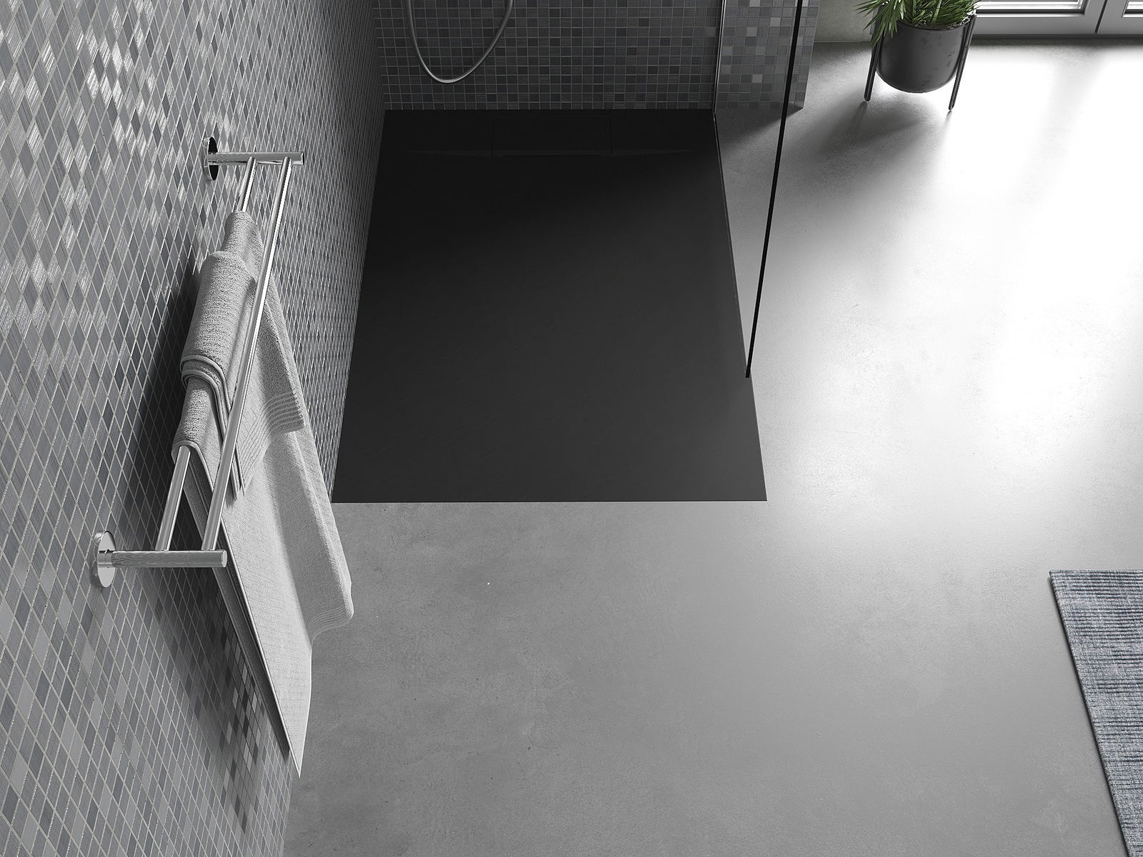 La surface du receveur de douche rappelle par sa structure la pierre. Elle constitue une combinaison exceptionnelle d'un aspect naturel et d'un aménagement intérieur moderne. Elle ajoute du caractère, souligne l'esthétique et l'élégance de la décoration de la salle de bains et séduit par sa forme.