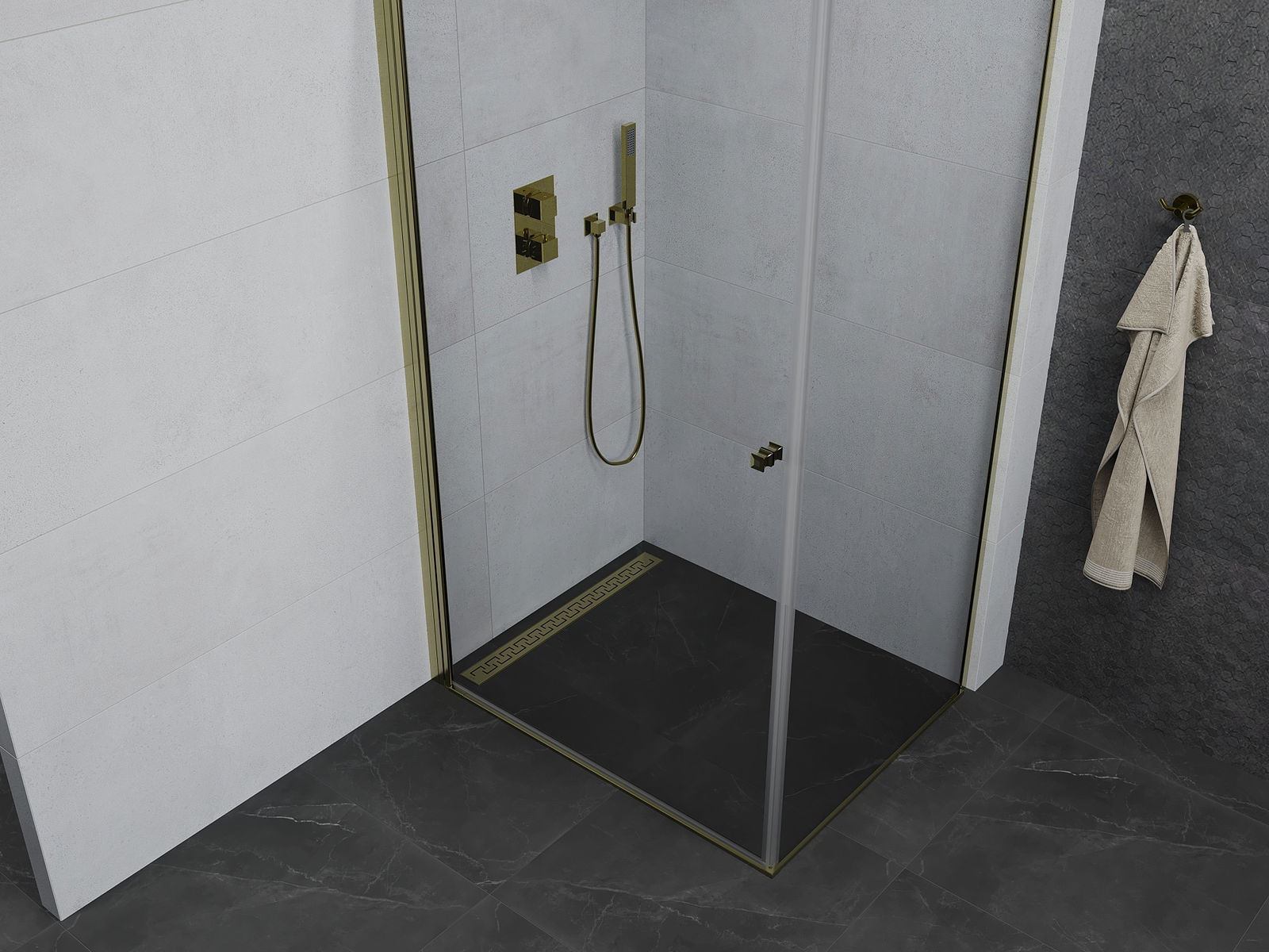 La poignée pratique et confortable est fabriquée en métal durable et résistant. Sa forme à la mode, combinée à une finition assortie à la couleur des profilés, donne à l'ensemble un aspect moderne et stylé, soulignant l'esthétique de chaque salle de bain.