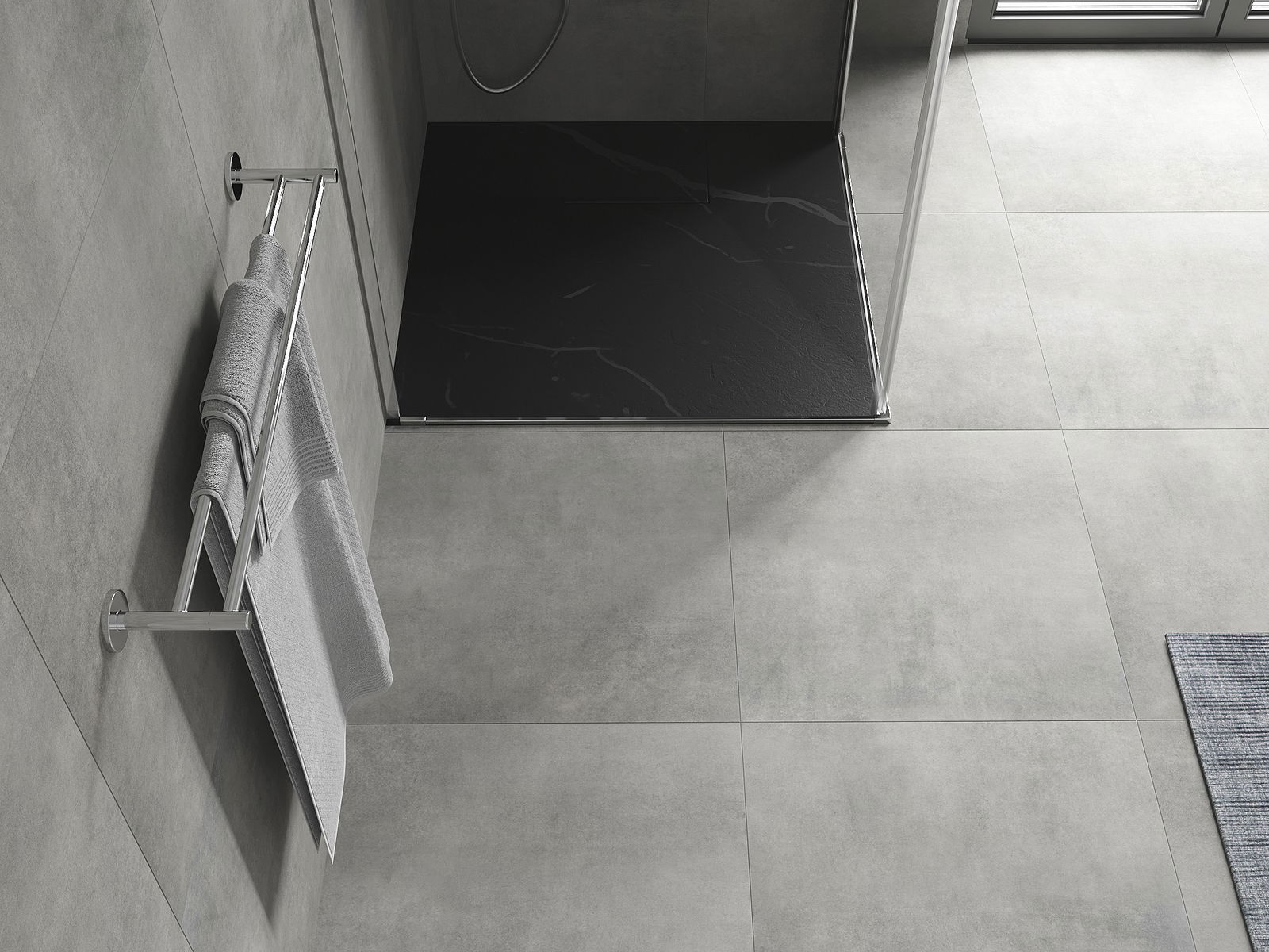 La surface du receveur de douche évoque la pierre. C'est une combinaison unique d'aspect naturel et de design intérieur moderne. Il ajoute du caractère, souligne l'esthétique et l'élégance de la salle de bains et séduit par sa forme.