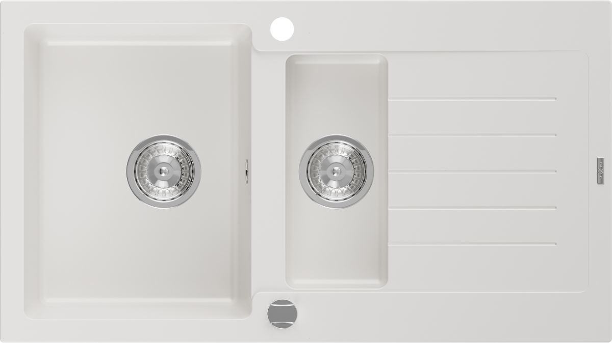 Mexen Matias évier en granit 1,5 cuves avec égouttoir 900 x 505 mm, blanc, siphon chromé - 6502901505-20
