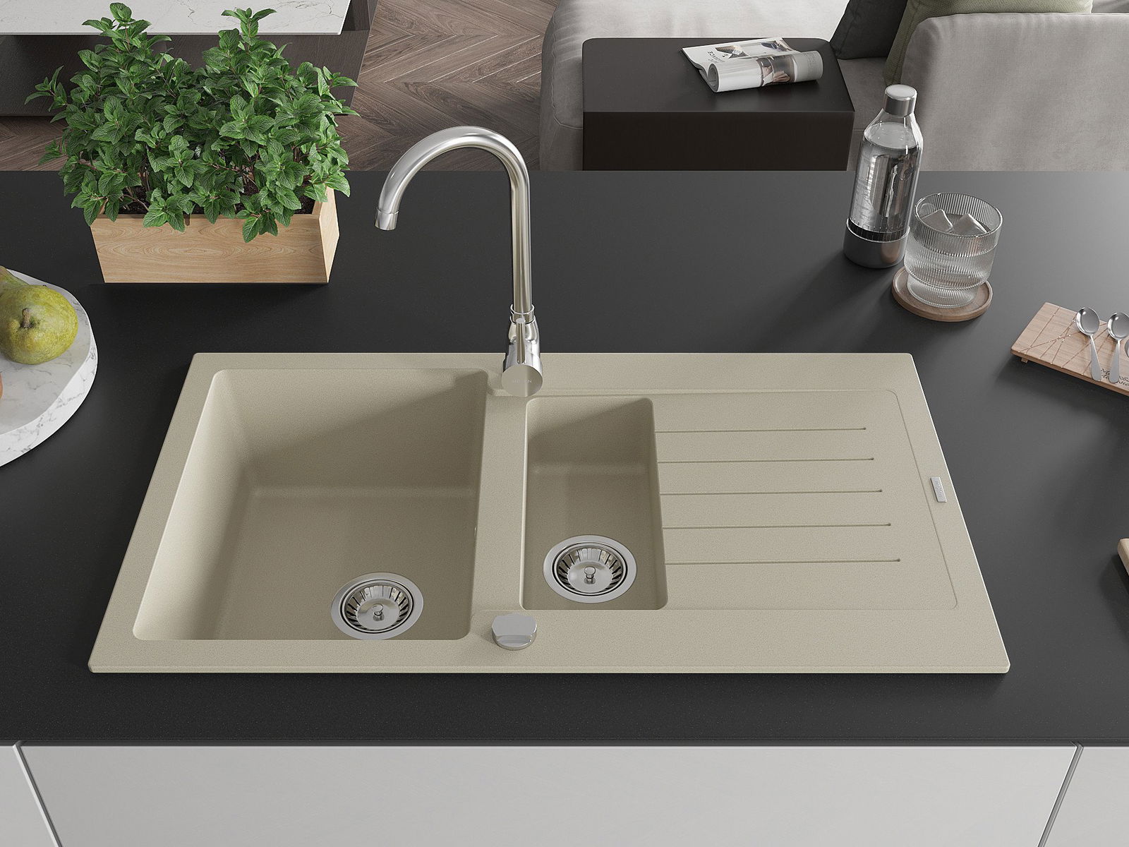 Mexen Matias évier en granit 1,5 bac avec égouttoir 900 x 505 mm, beige, siphon chromé - 6502901505-69