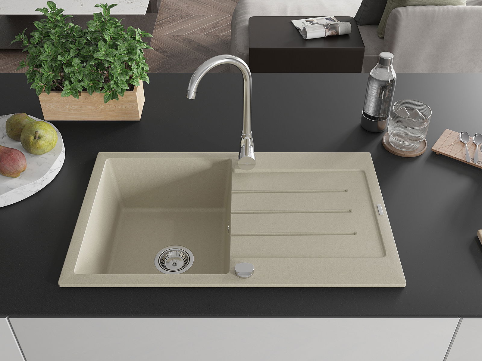 Mexen Bruno évier en granit 1 bac avec égouttoir 795 x 495 mm, beige, siphon chromé - 6513791010-69