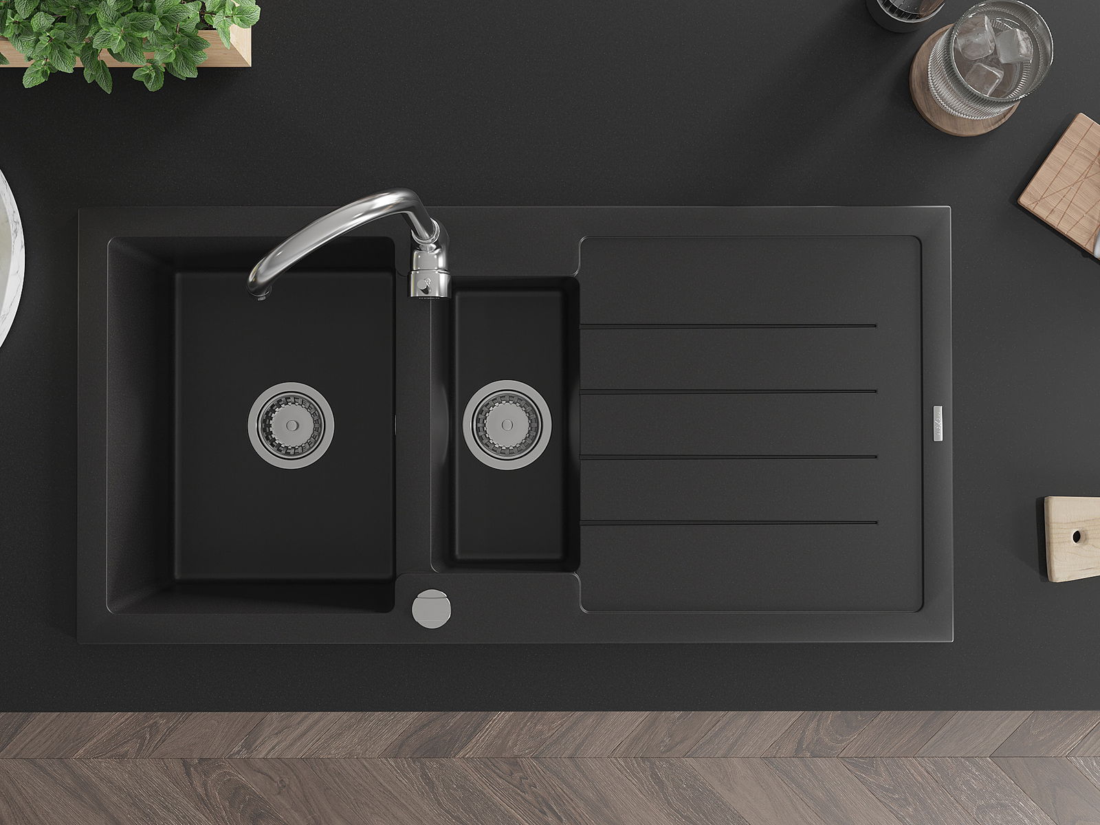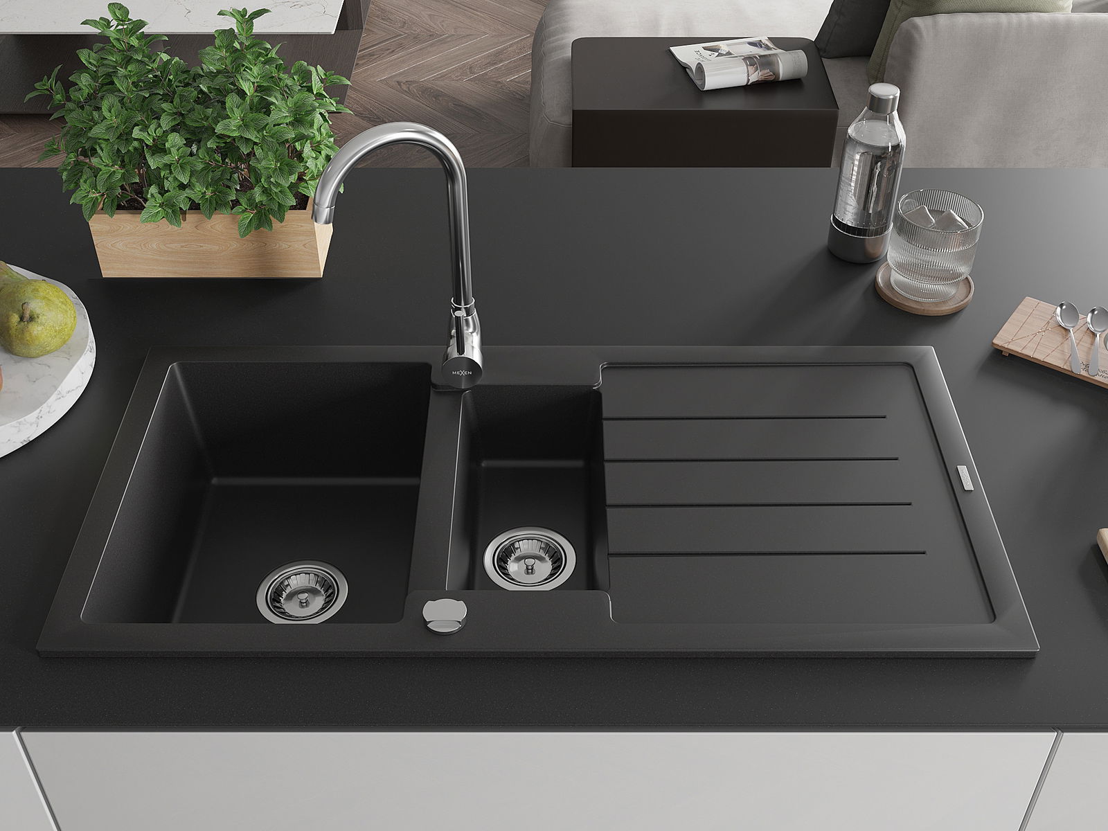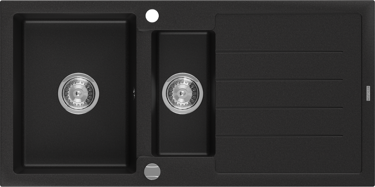 Mexen Andres évier en granit 1,5 bac avec égouttoir 1000 x 500 mm, noir, siphon chromé - 6515101510-77