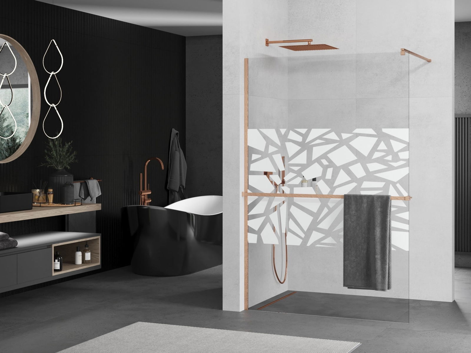 Mexen Kioto+ paroi de douche avec étagère Walk-in 110 x 200 cm, motif blanc, cuivre brossé - 800-110-121-65-85