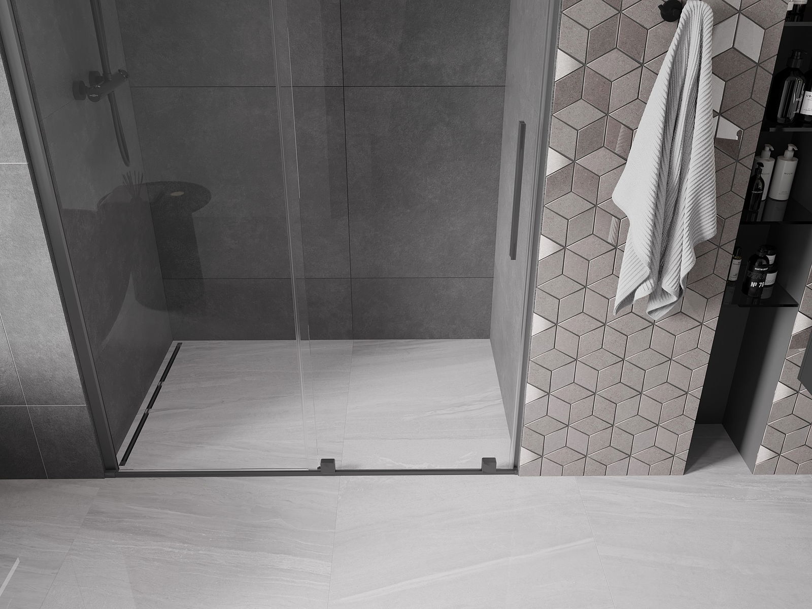 Poignée pratique et confortable en acier inoxydable. La forme moderne associée à une finition assortie à la couleur des profilés confère à l'ensemble un aspect moderne et élégant, soulignant l'esthétique de chaque salle de bain.
