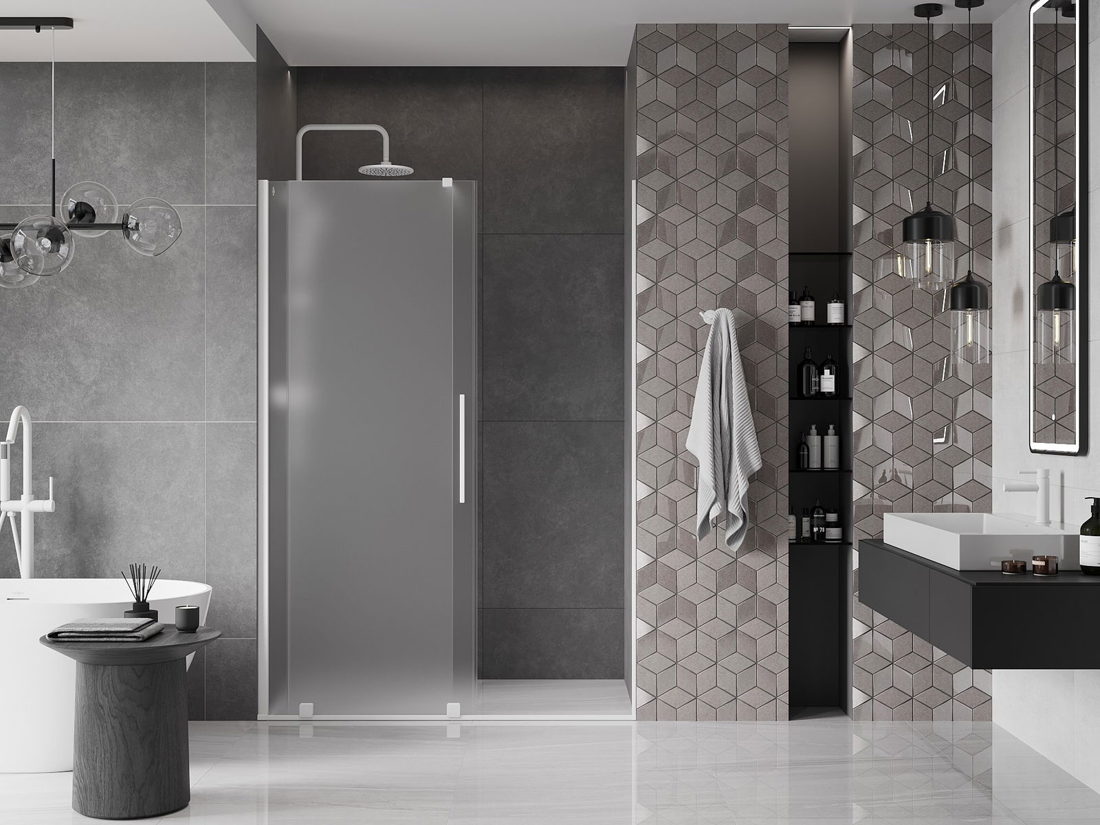 Poignée pratique et confortable en acier inoxydable. La forme moderne associée à une finition assortie à la couleur des profilés confère à l'ensemble un aspect moderne et élégant, soulignant l'esthétique de chaque salle de bain.