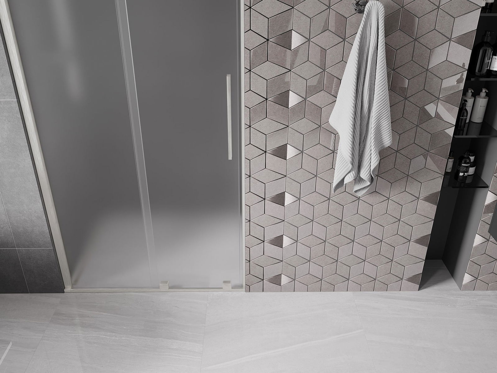 Poignée pratique et confortable en acier inoxydable. La forme moderne associée à une finition assortie à la couleur des profilés confère à l'ensemble un aspect moderne et élégant, soulignant l'esthétique de chaque salle de bain.