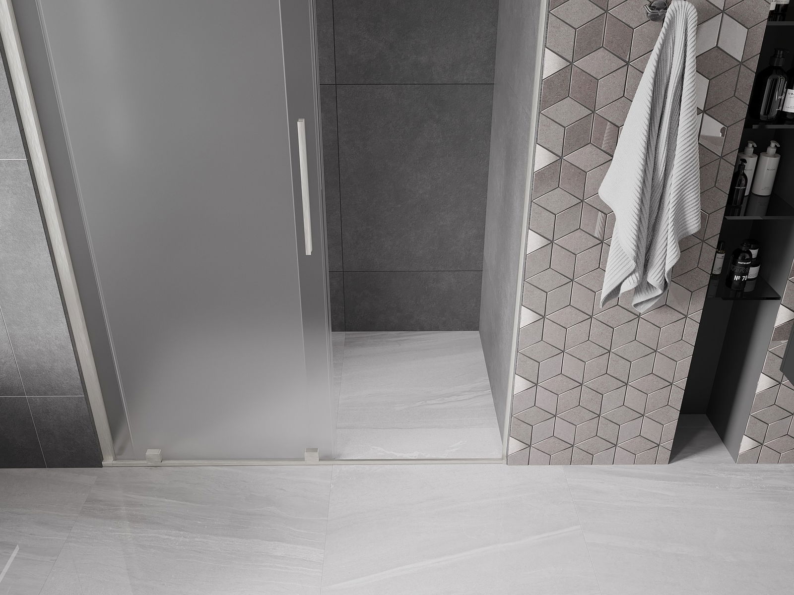 Poignée pratique et confortable en acier inoxydable. La forme moderne associée à une finition assortie à la couleur des profilés confère à l'ensemble un aspect moderne et élégant, soulignant l'esthétique de chaque salle de bain.