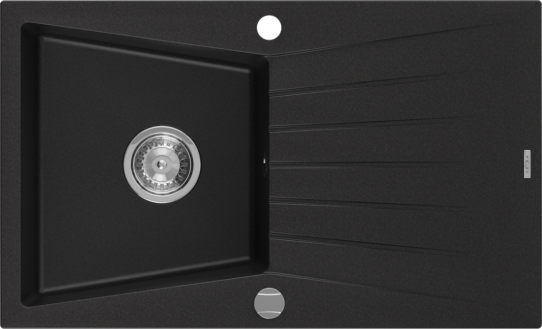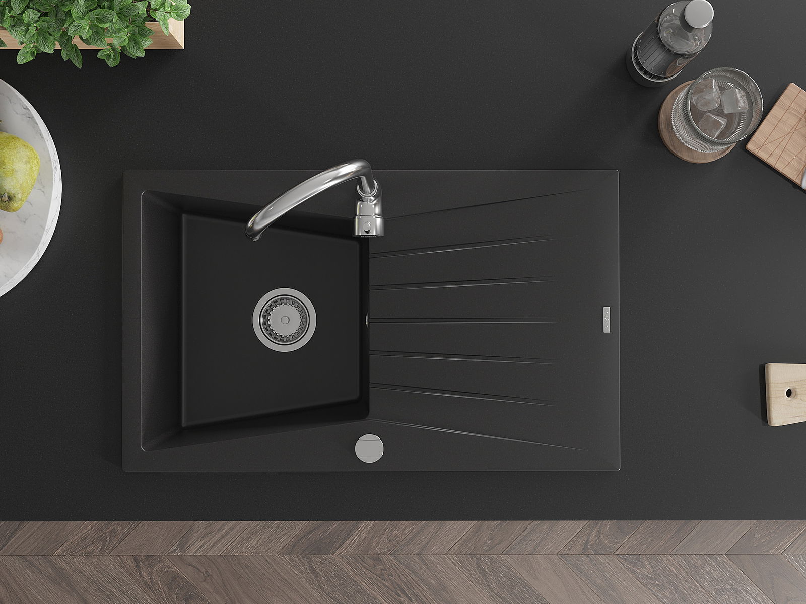 Mexen Cesar évier en granit 1 bac avec égouttoir 775 x 470 mm, noir, siphon chromé - 6514771010-77