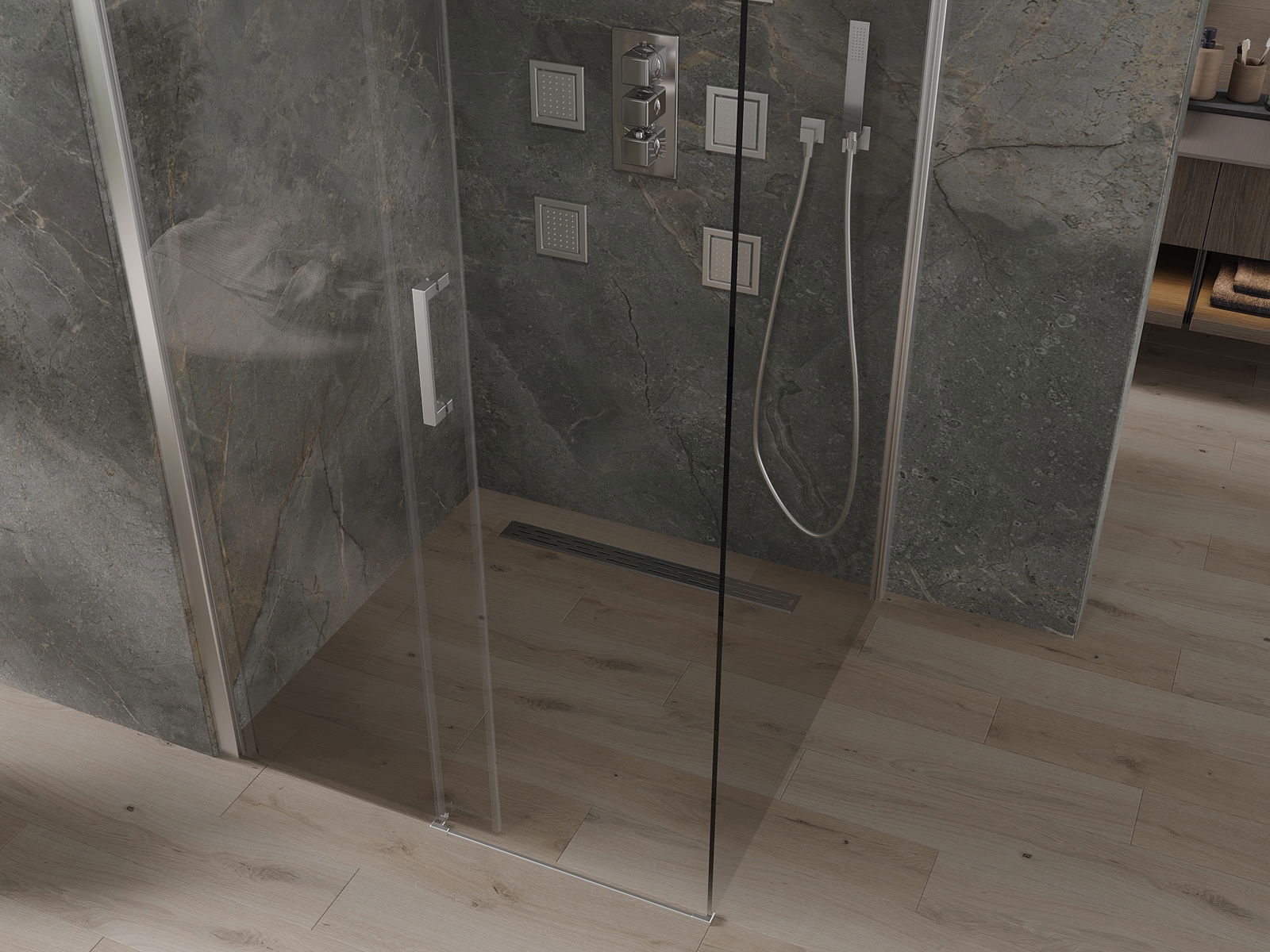 Les portes coulissantes se déplacent sur des rails spéciaux et ne nécessitent pas d'espace supplémentaire pour s'ouvrir. Elles conviennent donc aux petites salles de bains. Grâce à leurs doubles roulettes à corps métallique, leur mouvement est fluide.
