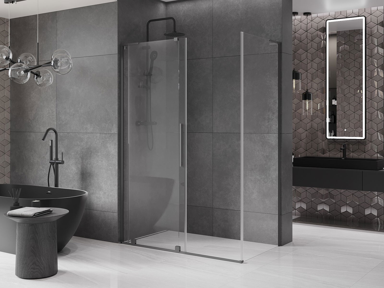 Poignée pratique et confortable en acier inoxydable. La forme moderne associée à une finition assortie à la couleur des profilés confère à l'ensemble un aspect moderne et élégant, soulignant l'esthétique de chaque salle de bain.