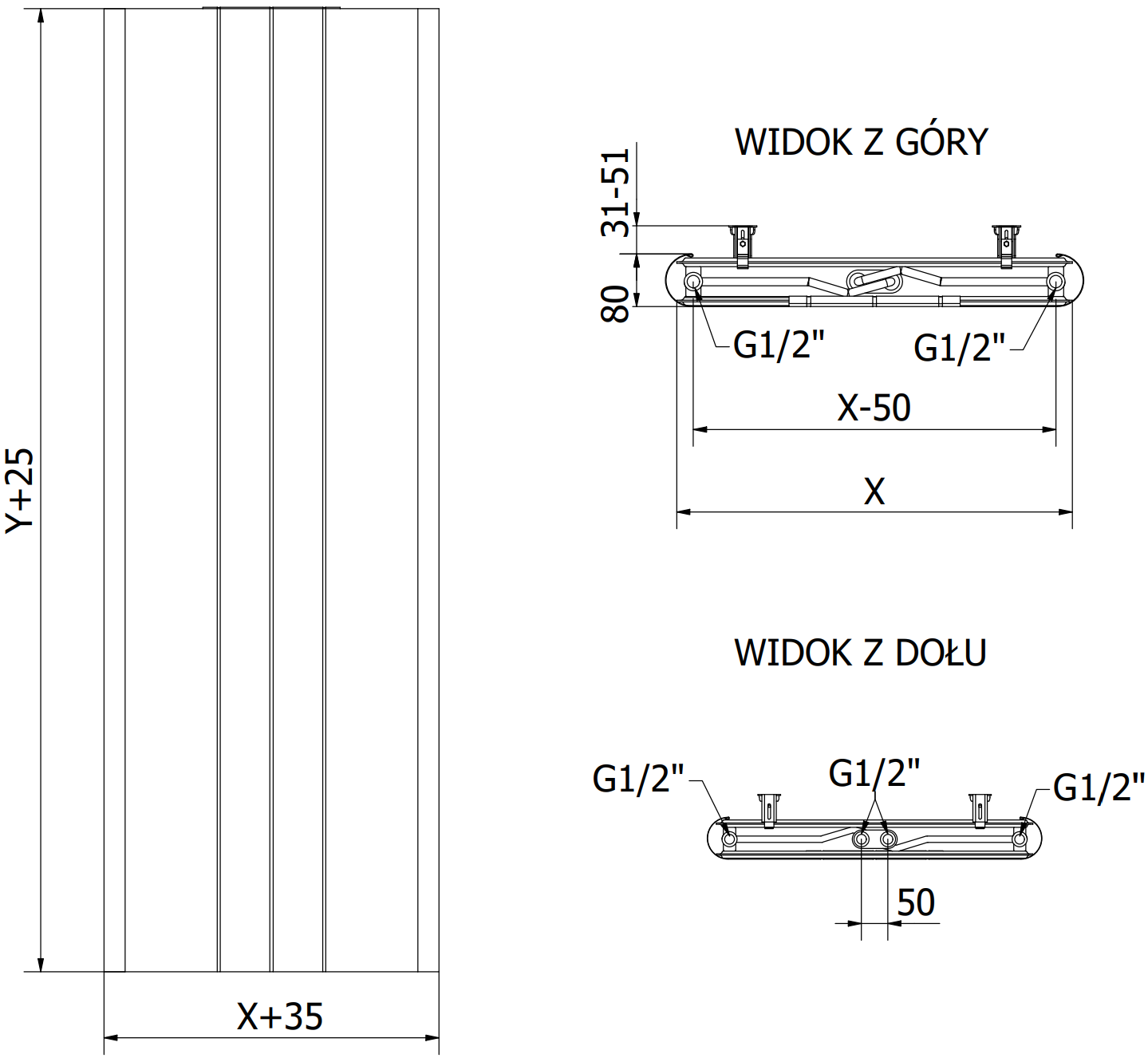 Entraxe des canaux d'eau verticaux : 33,3 mm