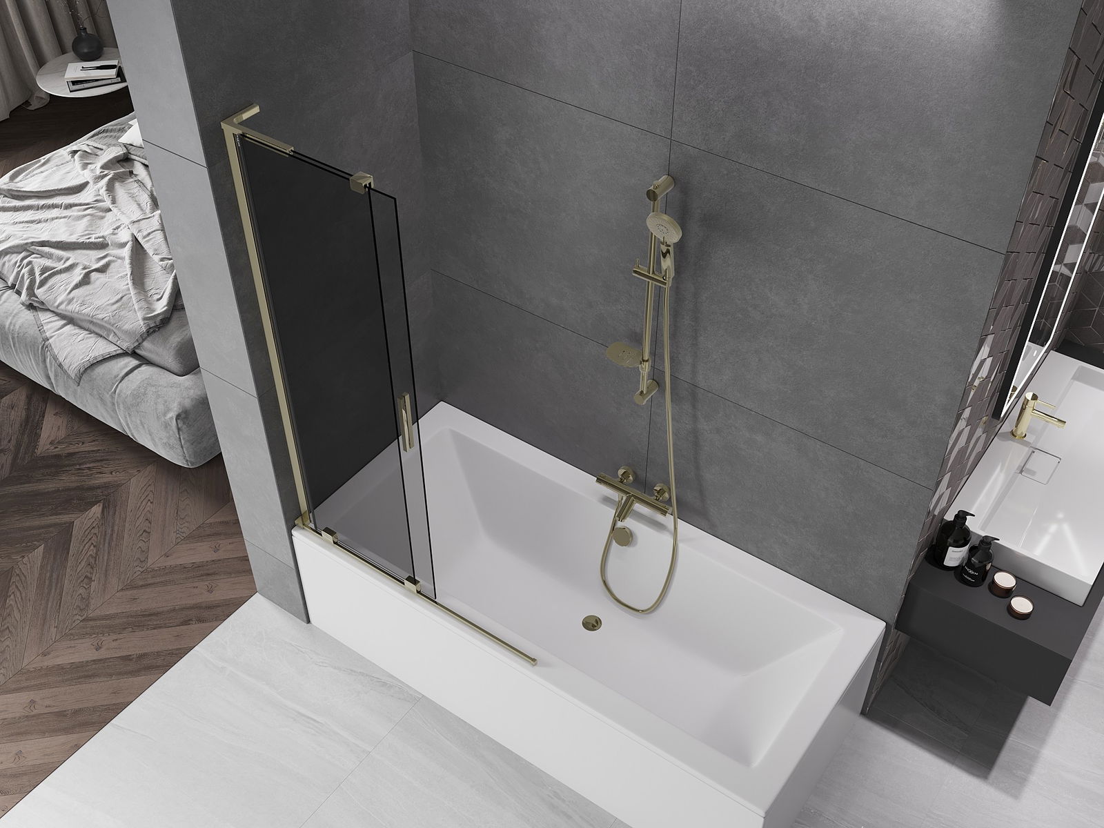 Mexen Velar L paroi de baignoire coulissante à 2 volets 100 x 150 cm, graphite, or - 896-100-003-41-50