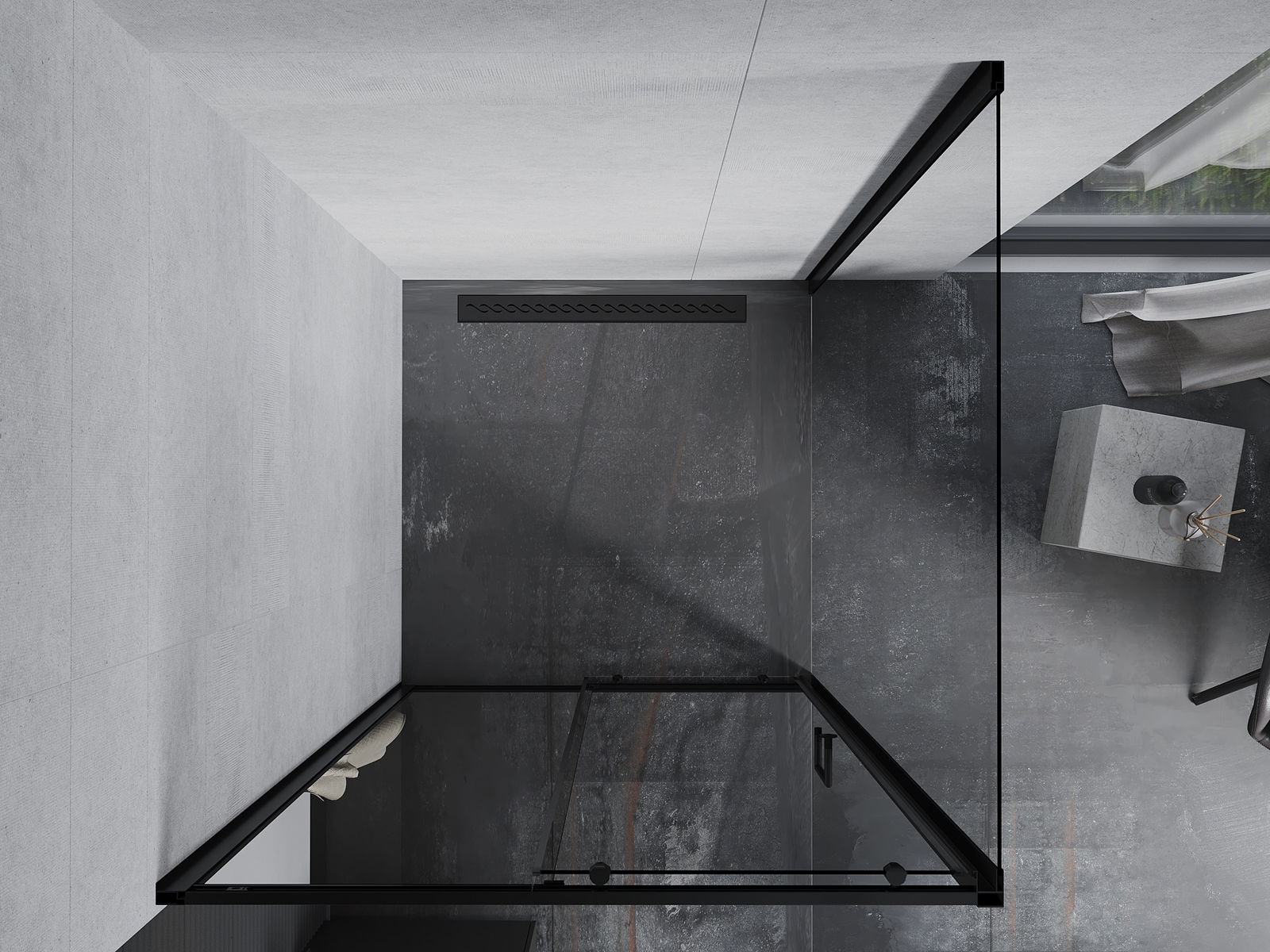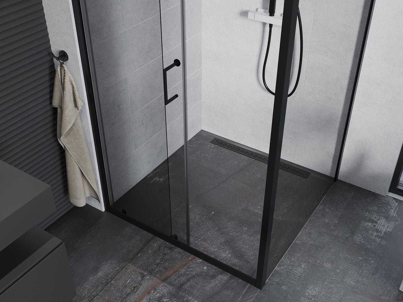 La poignée pratique et confortable est fabriquée en métal durable et résistant. Sa forme à la mode, combinée à une finition assortie à la couleur des profilés, donne à l'ensemble un aspect moderne et stylé, soulignant l'esthétique de chaque salle de bain.