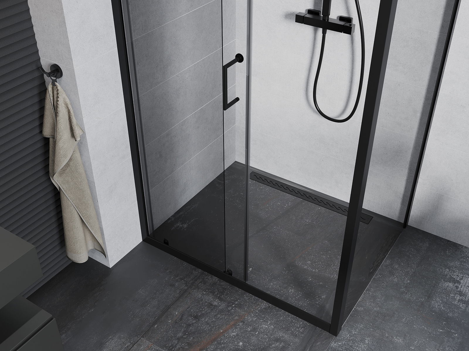 La poignée pratique et confortable est fabriquée en métal durable et résistant. Sa forme à la mode, combinée à une finition assortie à la couleur des profilés, donne à l'ensemble un aspect moderne et stylé, soulignant l'esthétique de chaque salle de bain.