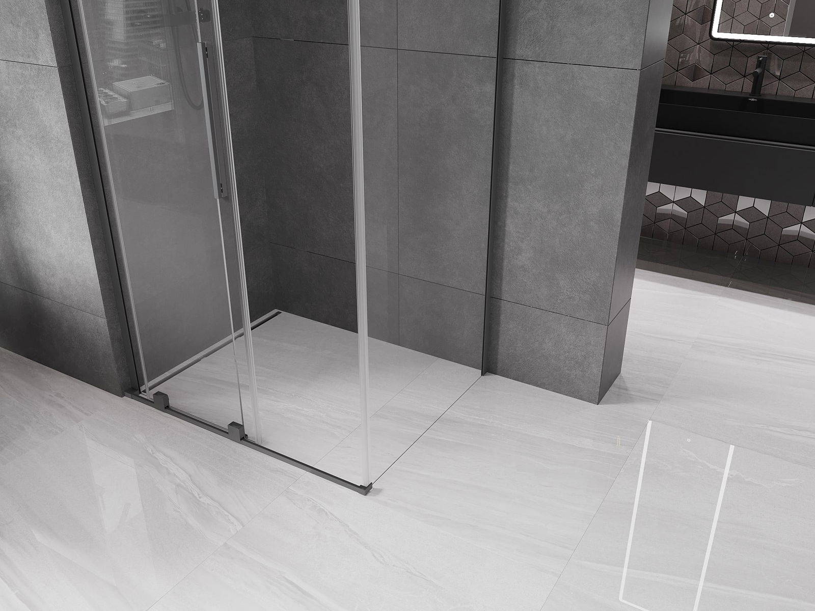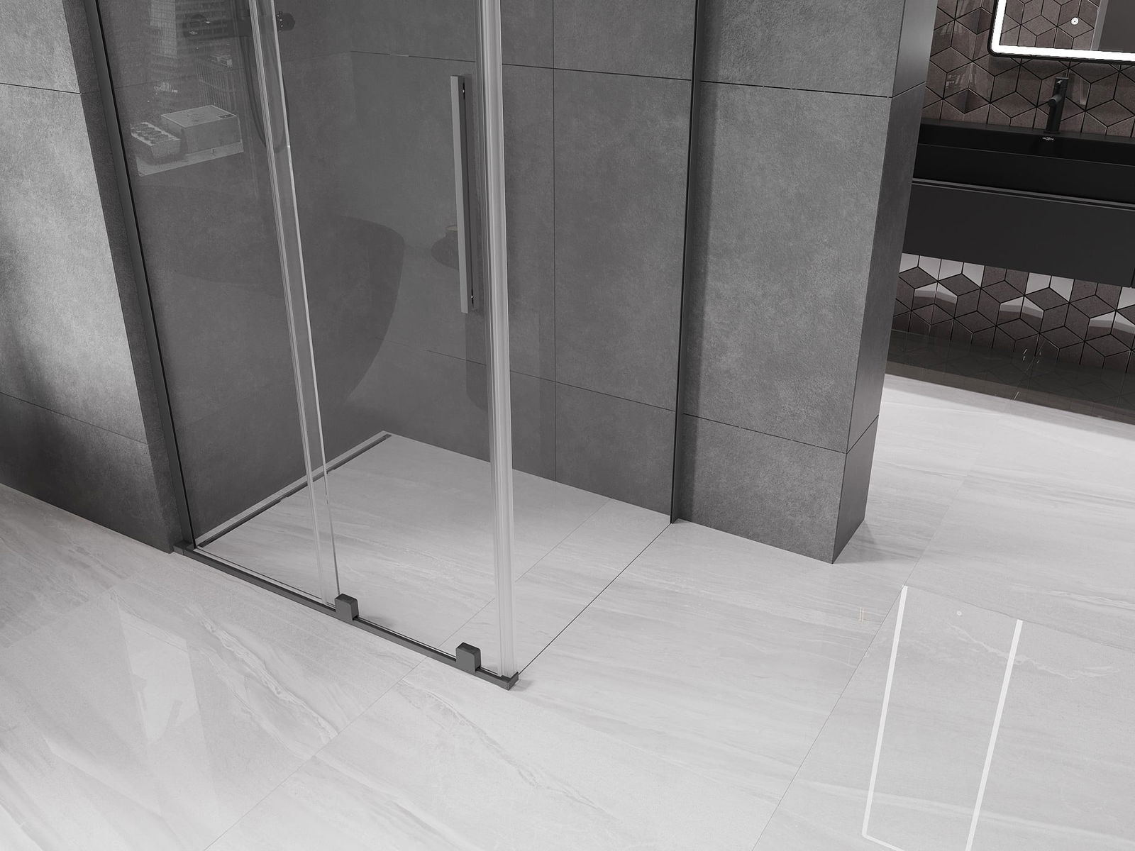Poignée pratique et confortable en acier inoxydable. La forme moderne associée à une finition assortie à la couleur des profilés confère à l'ensemble un aspect moderne et élégant, soulignant l'esthétique de chaque salle de bain.
