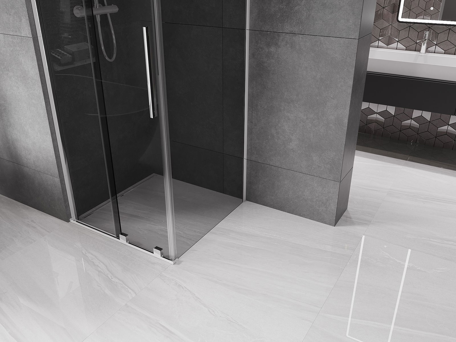 Poignée pratique et confortable en acier inoxydable. La forme moderne associée à une finition assortie à la couleur des profilés confère à l'ensemble un aspect moderne et élégant, soulignant l'esthétique de chaque salle de bain.