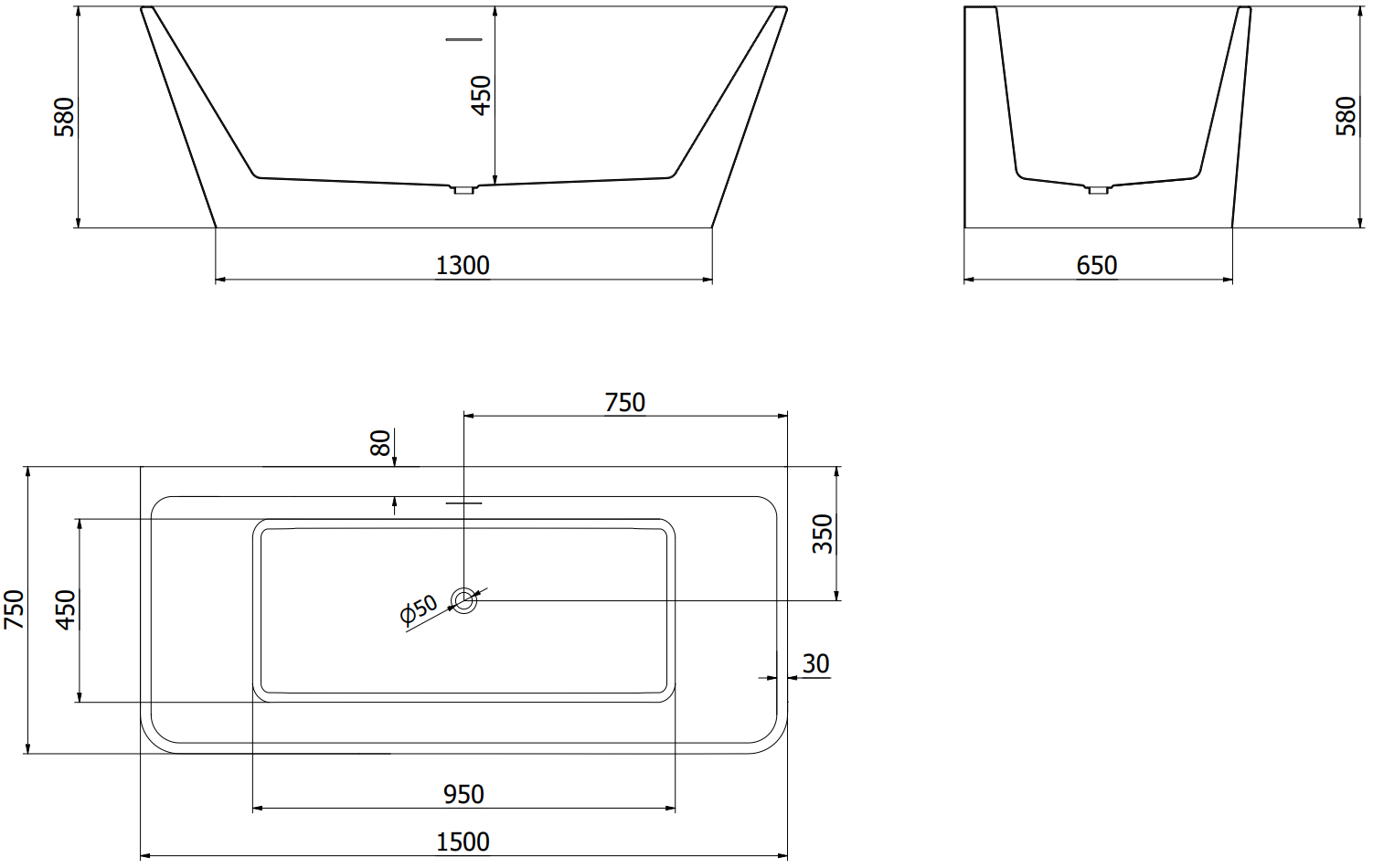 Mexen Volta baignoire îlot adossée 150 x 75 cm, blanc/noir, trop-plein noir - 51131507575-70