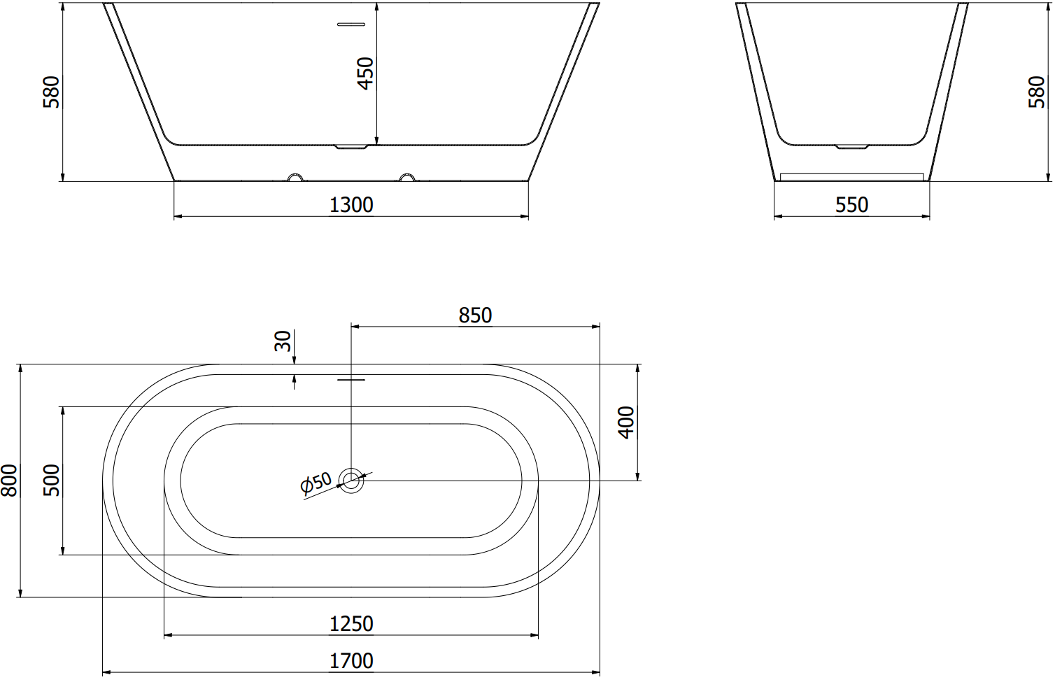 Mexen Luna baignoire autoportante 170 x 80 cm, blanc/noir, trop-plein noir - 52031708075-70