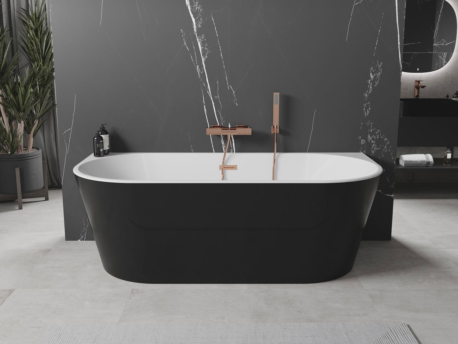 Baignoire ovale autoportante, de dimensions 160 x 80 cm, idéale pour les salles de bains modernes. Fabriquée en acrylique sanitaire, elle se distingue par sa haute résistance au ternissement et aux rayons UV. La couleur blanche et noire combinée à la finition or rose confère une élégance certaine. La baignoire est conçue avec une ouverture pour trop-plein et un syphon inclus, ce qui en fait un choix fonctionnel. Grâce à son écoulement central et à son installation adossée, elle s'adapte parfaitement à tout espace.