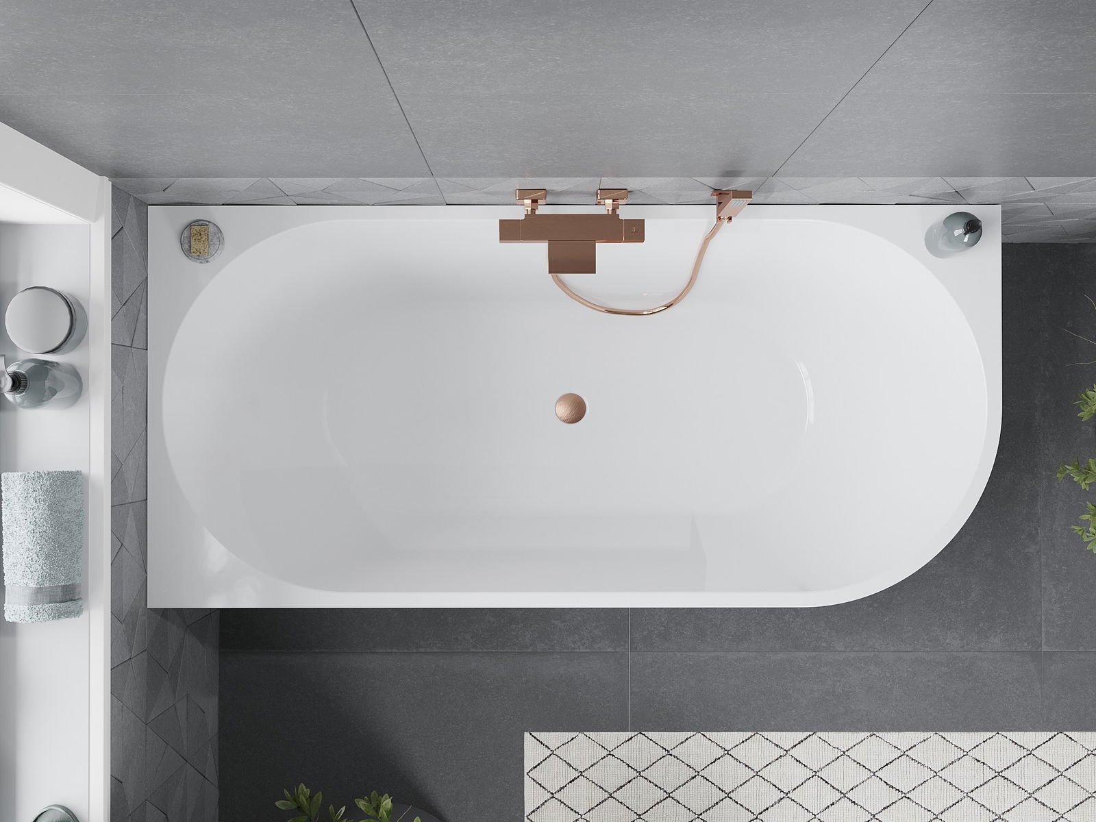 Mexen Mia baignoire autoportante d'angle gauche 150 x 75 cm, blanche, trop-plein en cuivre brossé - 52691507500L-65