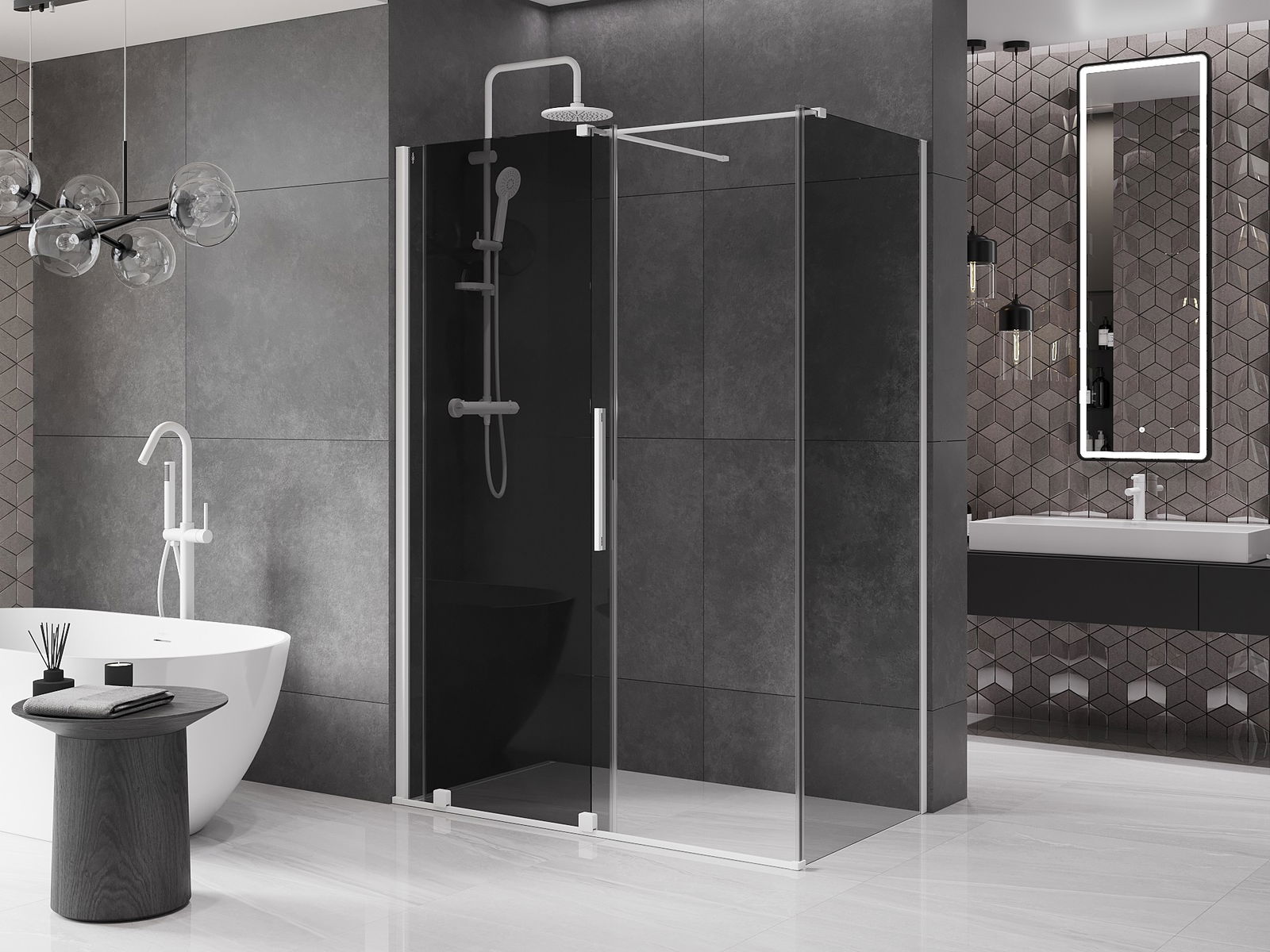 Poignée pratique et confortable en acier inoxydable. La forme moderne associée à une finition assortie à la couleur des profilés confère à l'ensemble un aspect moderne et élégant, soulignant l'esthétique de chaque salle de bain.