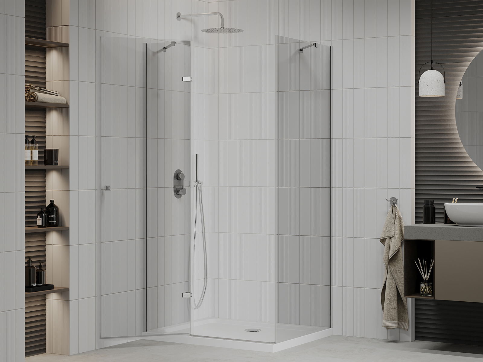La poignée pratique et confortable est fabriquée en métal durable et résistant. Sa forme à la mode, combinée à une finition assortie à la couleur des profilés, donne à l'ensemble un aspect moderne et stylé, soulignant l'esthétique de chaque salle de bain.