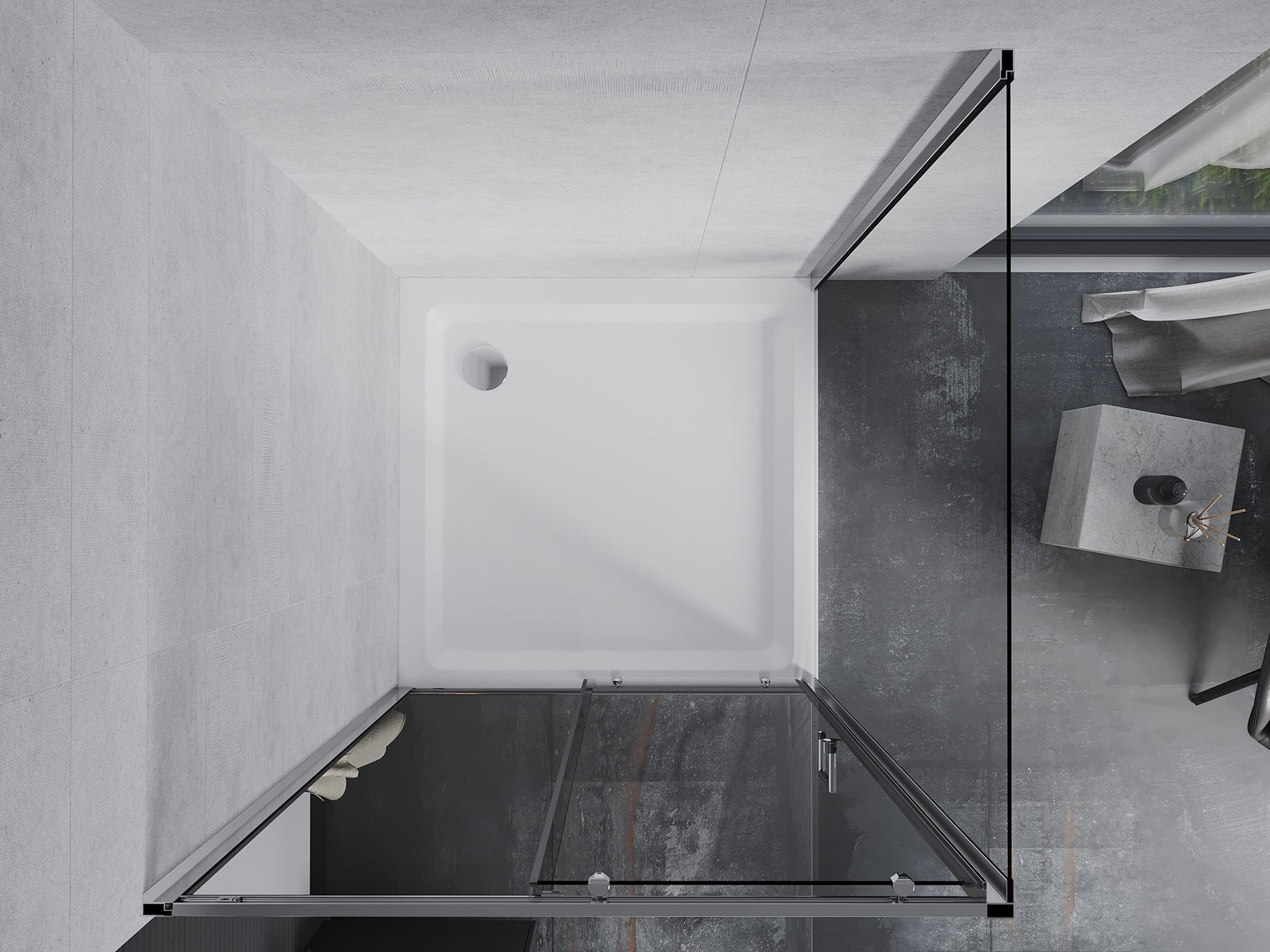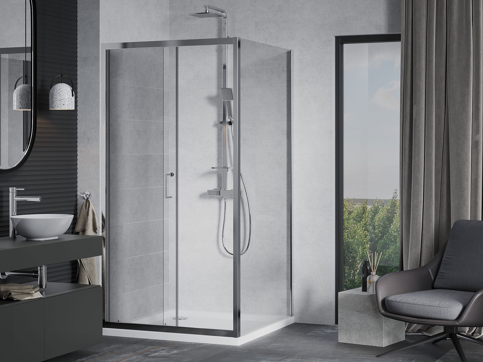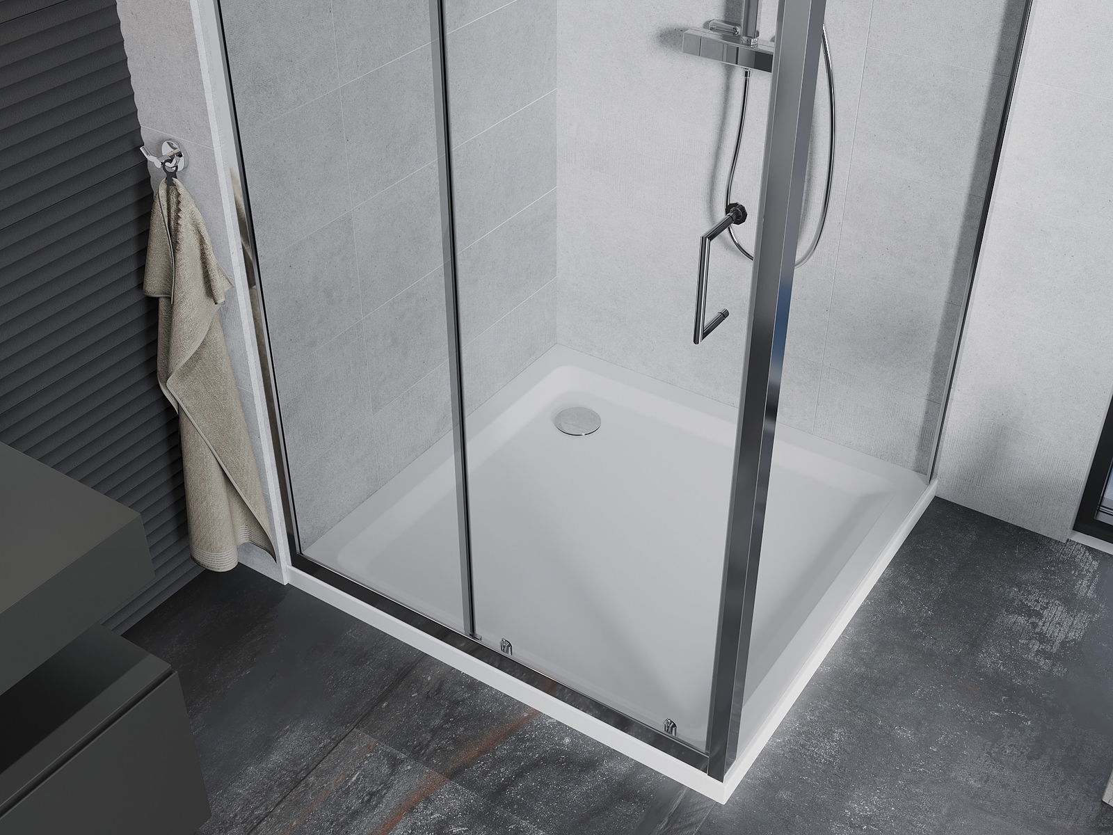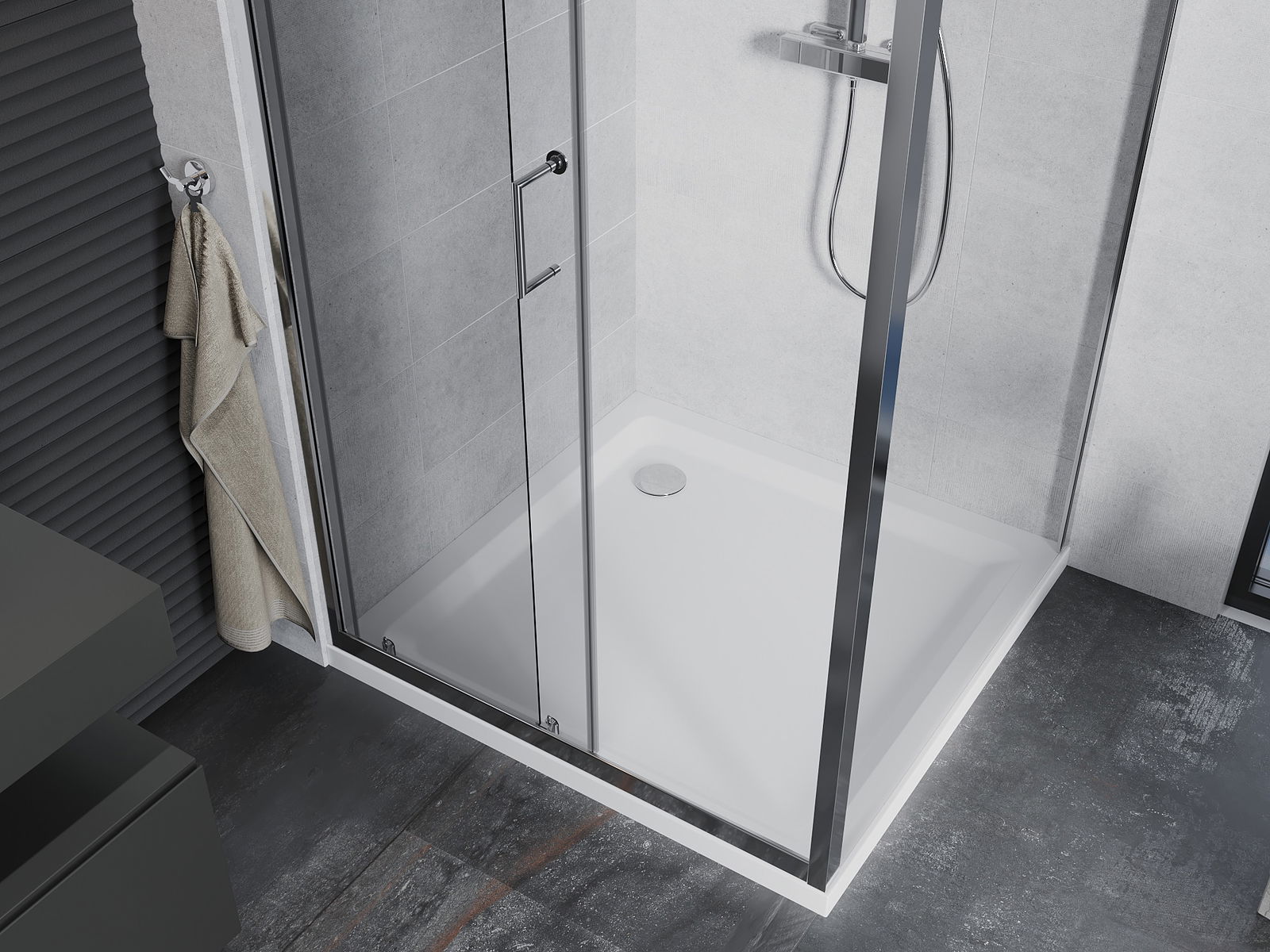 La poignée pratique et confortable est fabriquée en métal durable et résistant. Sa forme élégante, associée à une finition assortie à la couleur des profilés, confère à l'ensemble un style moderne et élégant, soulignant l'esthétique de chaque salle de bains.