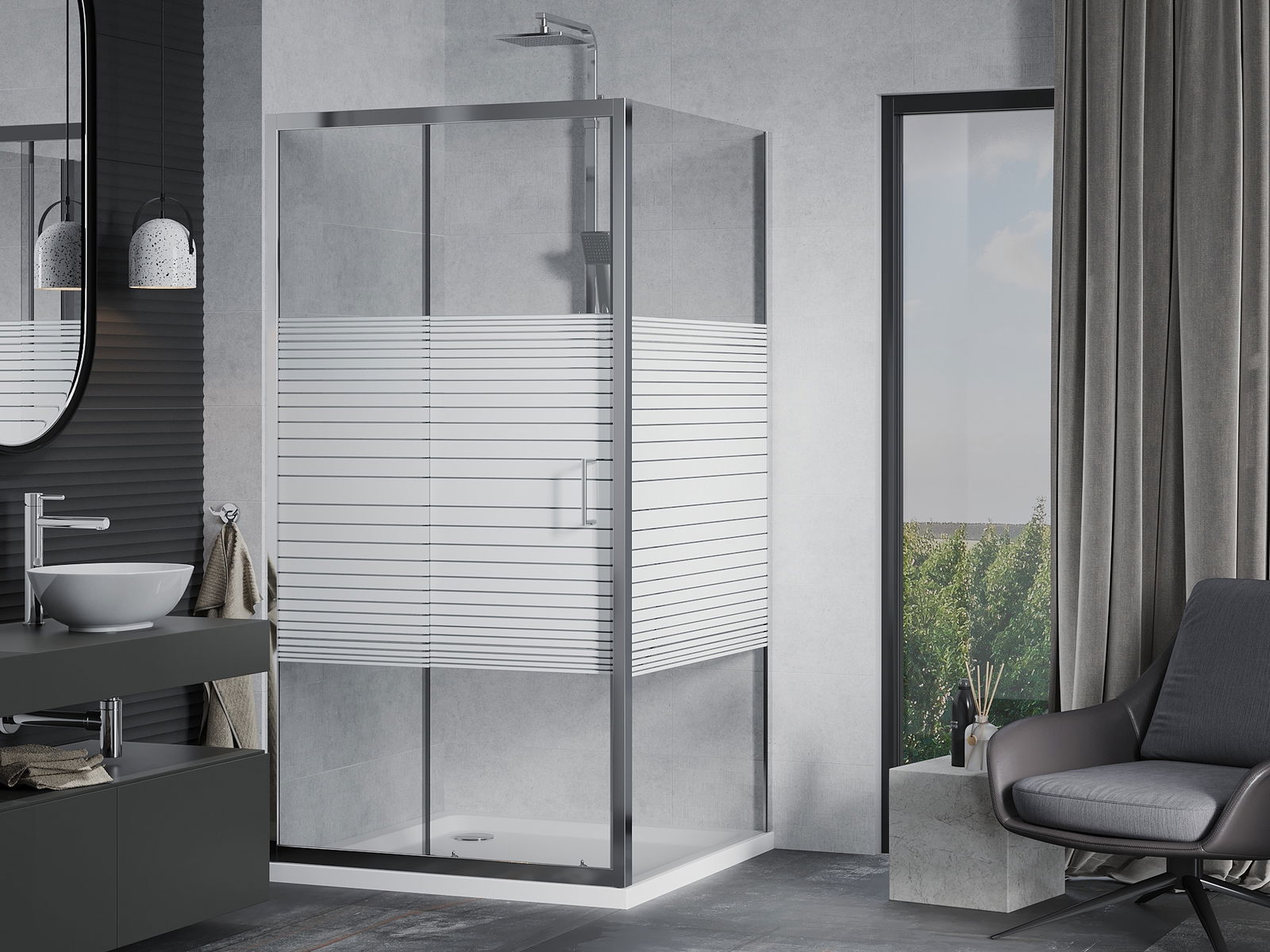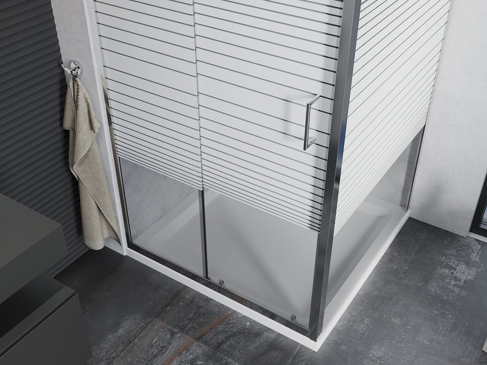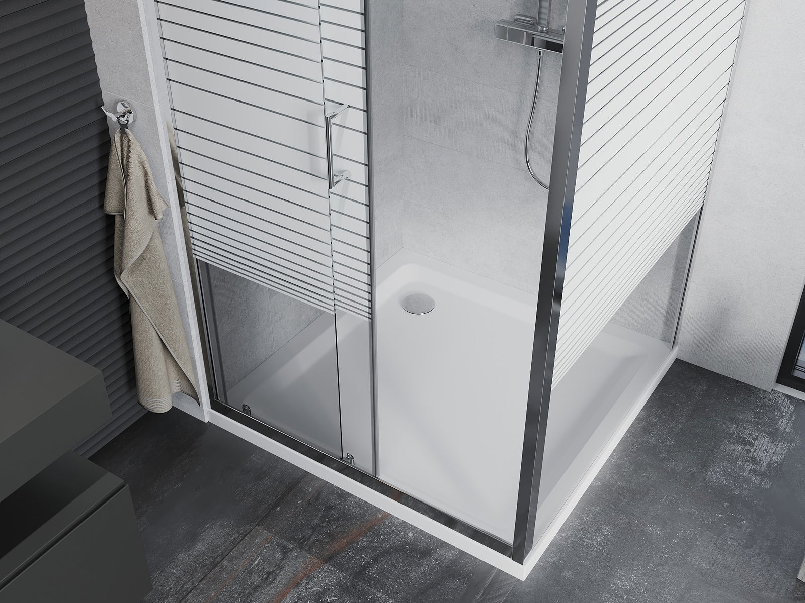 La poignée pratique et confortable est fabriquée en métal durable et résistant. Sa forme à la mode, combinée à une finition assortie à la couleur des profilés, donne à l'ensemble un aspect moderne et stylé, soulignant l'esthétique de chaque salle de bain.