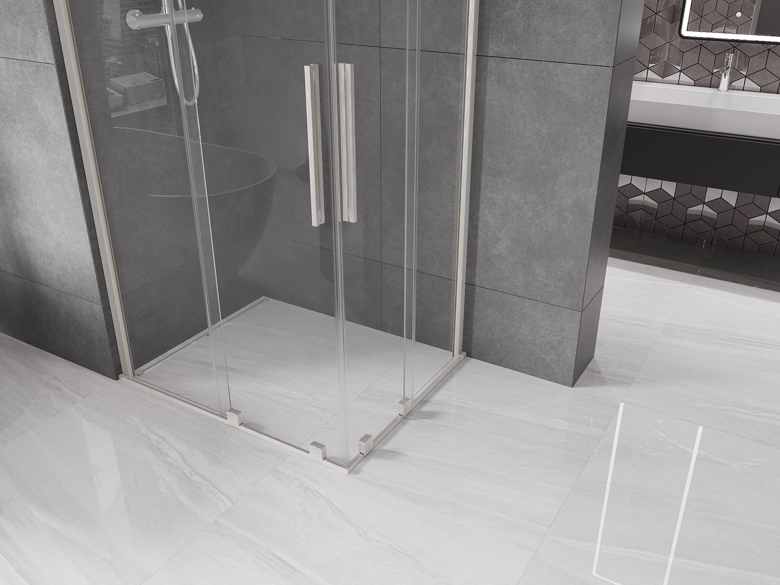 Poignée pratique et confortable en acier inoxydable. La forme moderne associée à une finition assortie à la couleur des profilés confère à l'ensemble un aspect moderne et élégant, soulignant l'esthétique de chaque salle de bain.