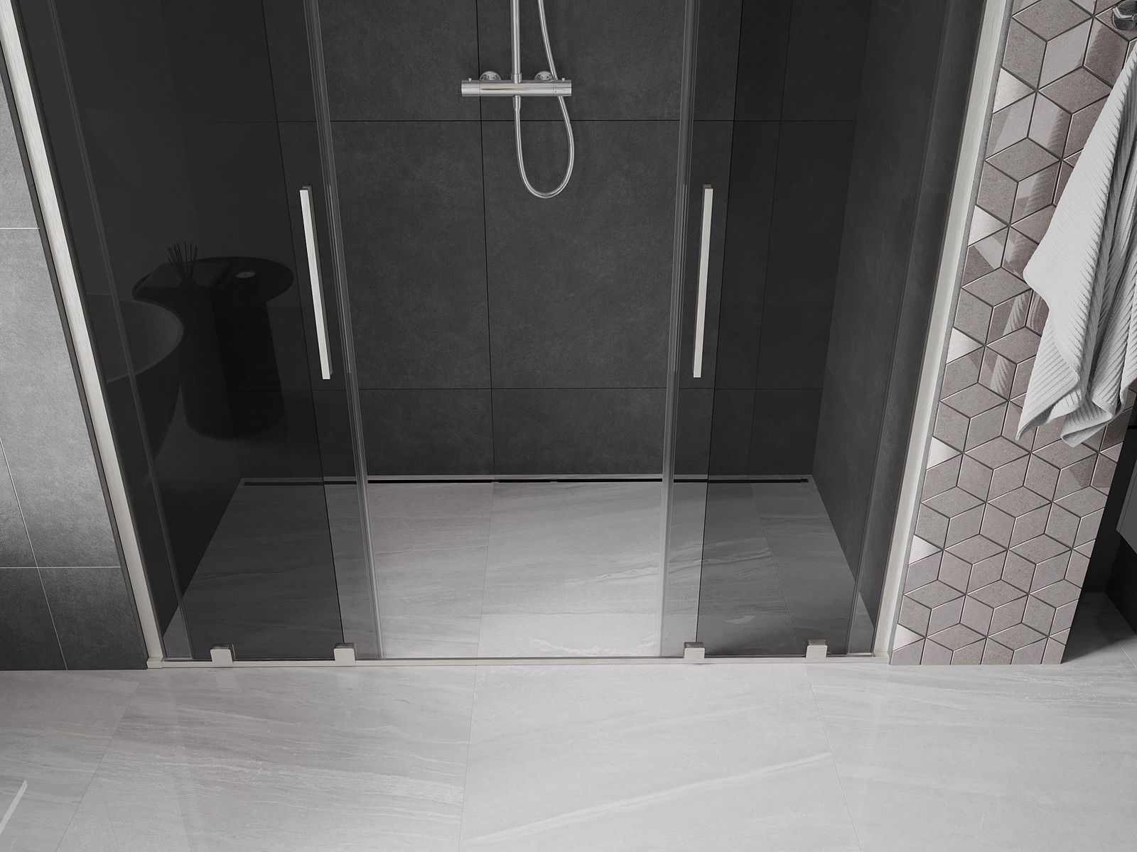 Poignée pratique et confortable en acier inoxydable. La forme moderne associée à une finition assortie à la couleur des profilés confère à l'ensemble un aspect moderne et élégant, soulignant l'esthétique de chaque salle de bain.