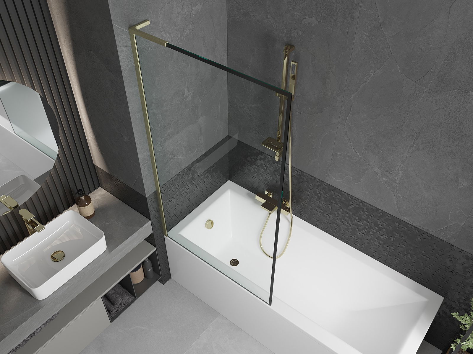 Mexen Next L paroi de baignoire 1 volet 90 x 150 cm, cadre noir, doré brossé - 895-090-000-03-70-55
