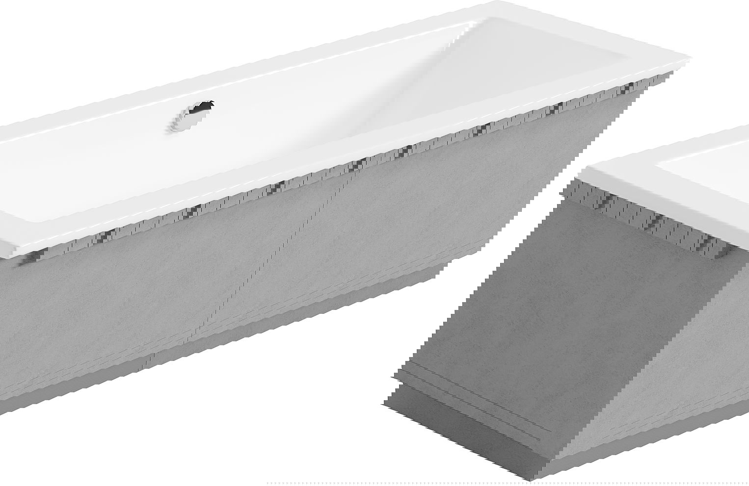 Le boîtier possède en bas une découpe pour l’éclairage LED ainsi que pour les pieds, ce qui permet une utilisation confortable de la baignoire. C’est une solution moderne, souvent utilisée dans le design de salle de bain, qui augmente la fonctionnalité et l'esthétique de l’espace.