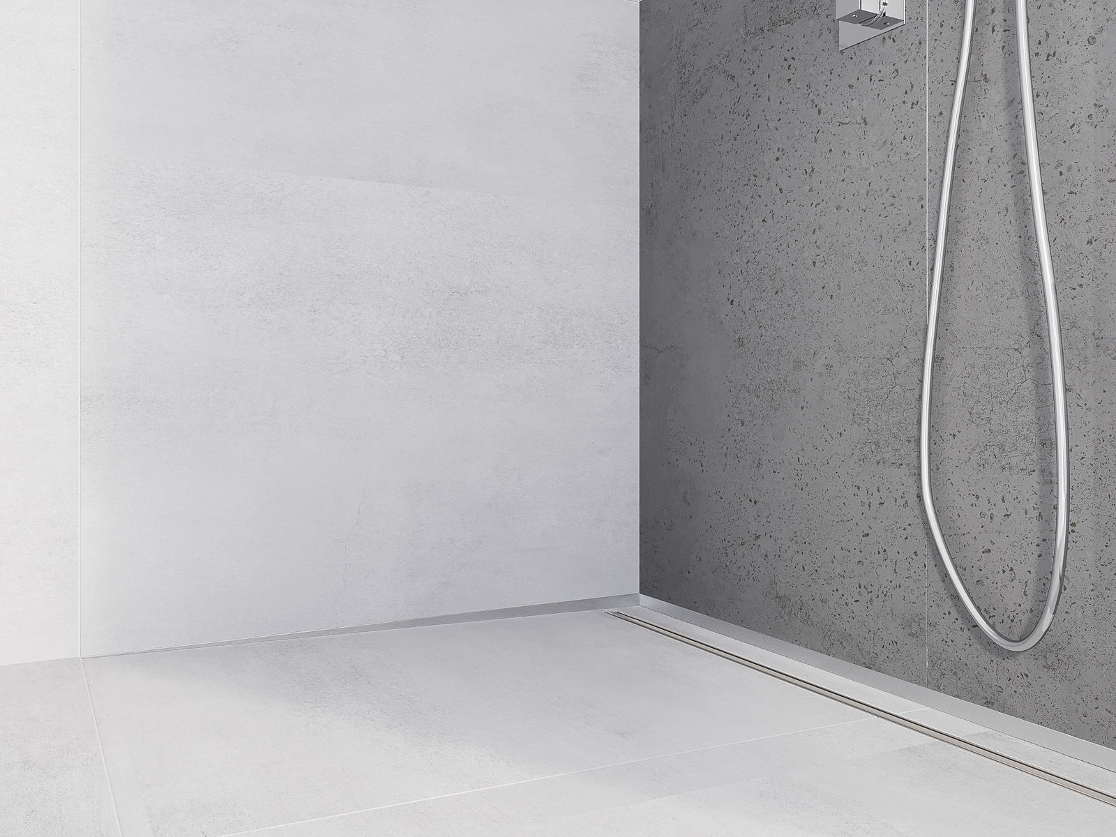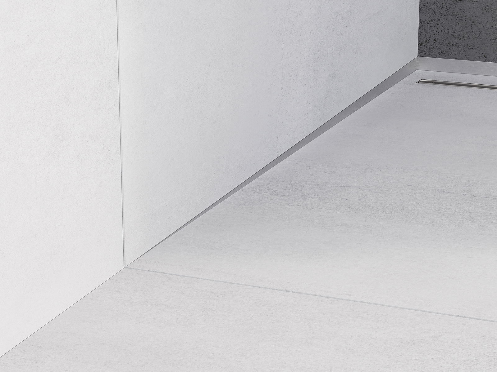 L'utilisation d'une bande inclinée élimine la nécessité de créer une enveloppe en carrelage, ce qui simplifie considérablement l'installation d'un caniveau linéaire. Cette solution permet d'éviter des travaux supplémentaires et chronophages, comme la réalisation d'une enveloppe, normalement nécessaire pour obtenir la pente adéquate du sol.