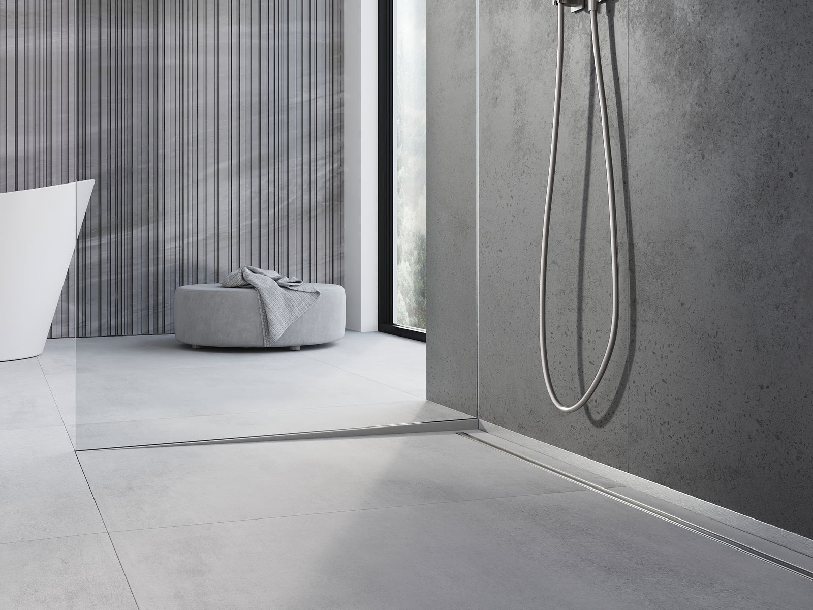 Le bord latéral de la plinthe impose une pente unilatérale vers le drain linéaire sans avoir besoin de faire une enveloppe
