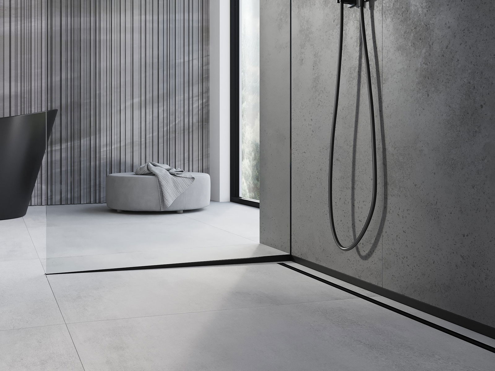 L'utilisation d'une bande inclinée élimine la nécessité de créer une enveloppe en carrelage, ce qui simplifie considérablement l'installation d'un caniveau linéaire. Cette solution permet d'éviter des travaux supplémentaires et chronophages, comme la réalisation d'une enveloppe, normalement nécessaire pour obtenir la pente adéquate du sol.