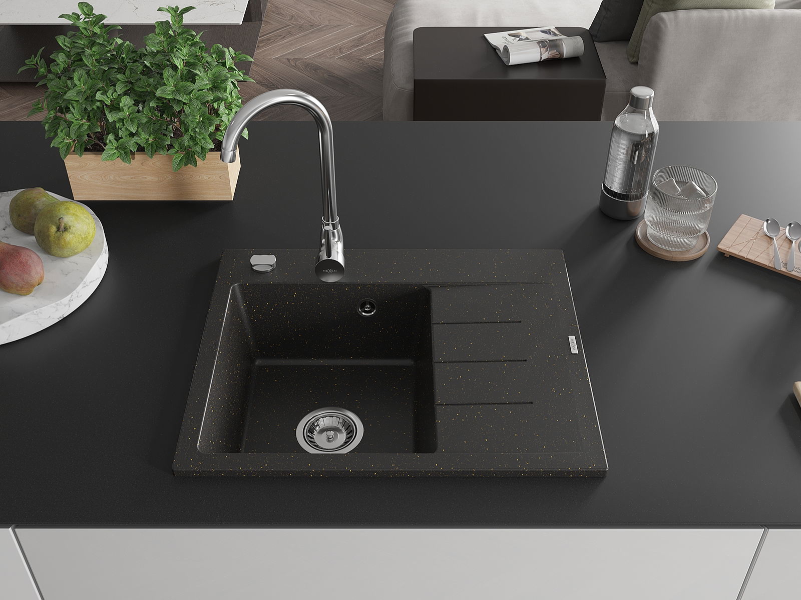 Mexen Ben Évier en granit 1 bac avec égouttoir, gauche 600 x 500 mm, noir/métallique doré, siphon chromé - 6522605000-75