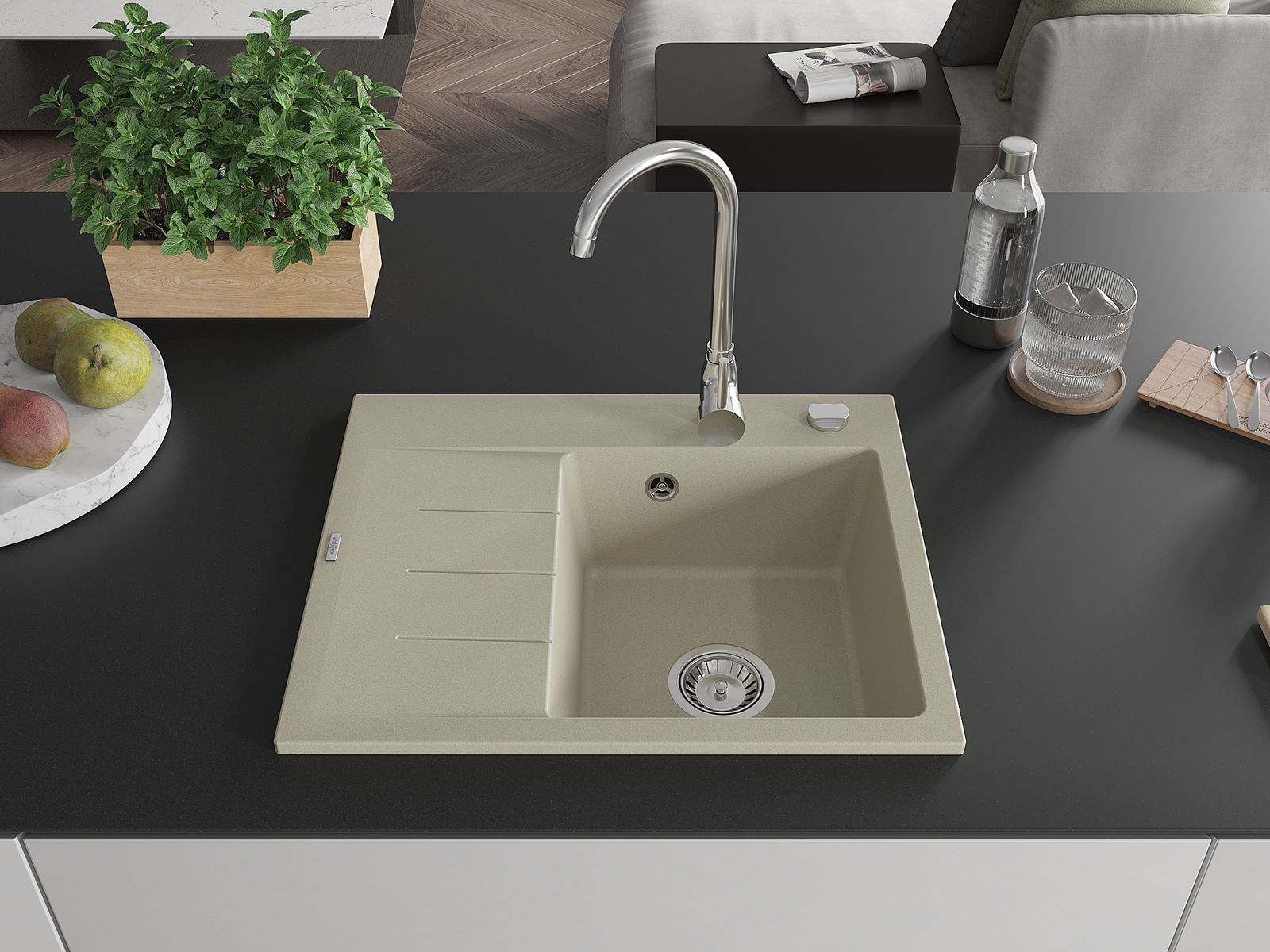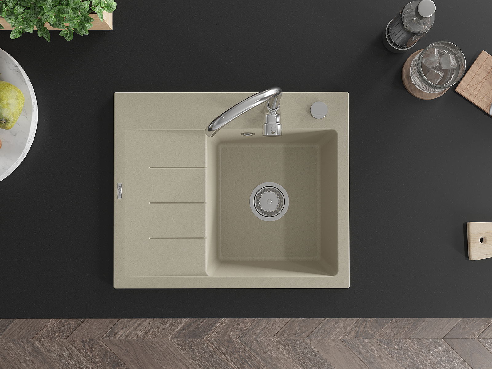 Mexen Ben évier en granit 1 bac avec égouttoir, à droite 600 x 500 mm, beige, siphon chromé - 6523605000-69