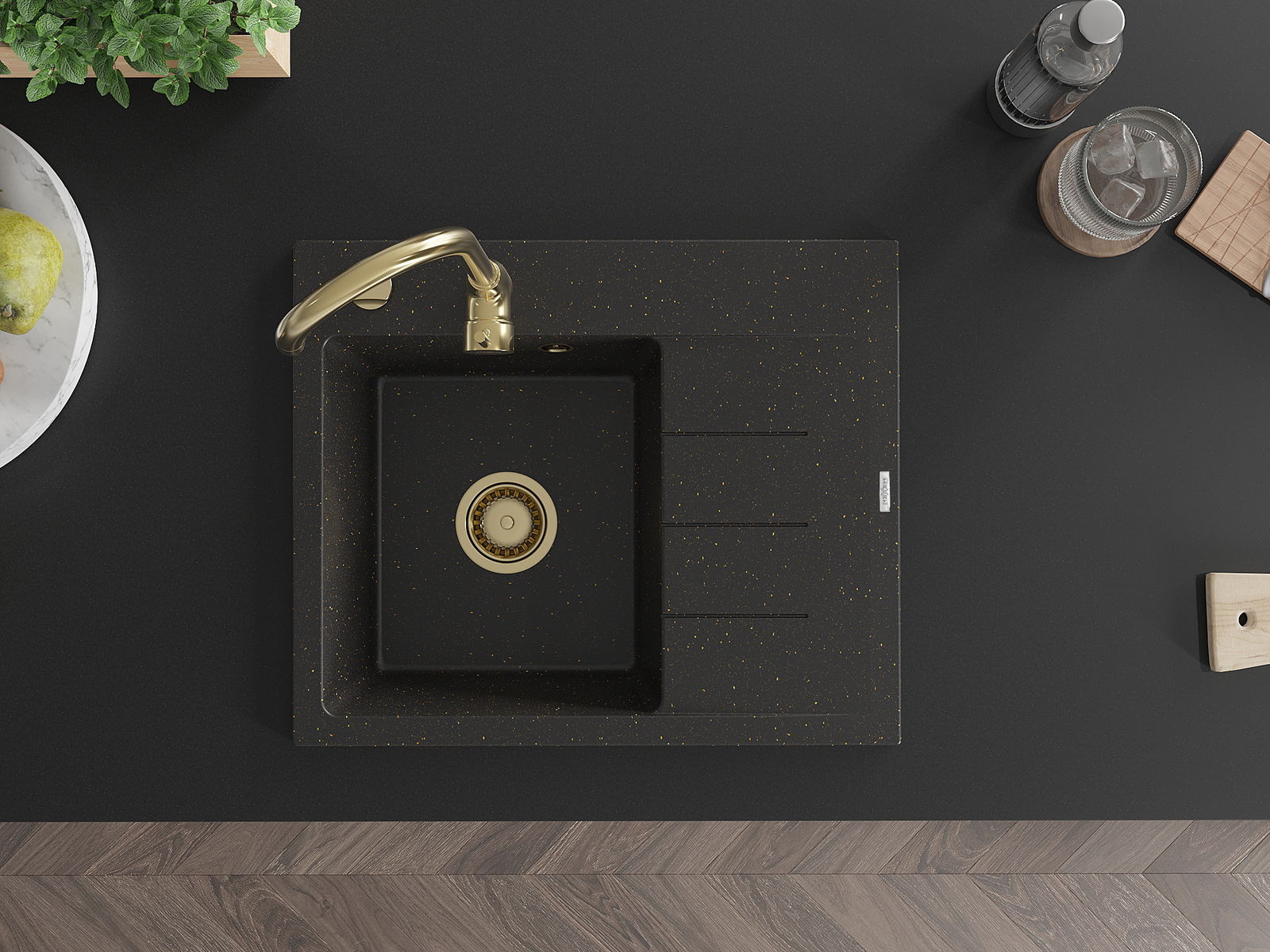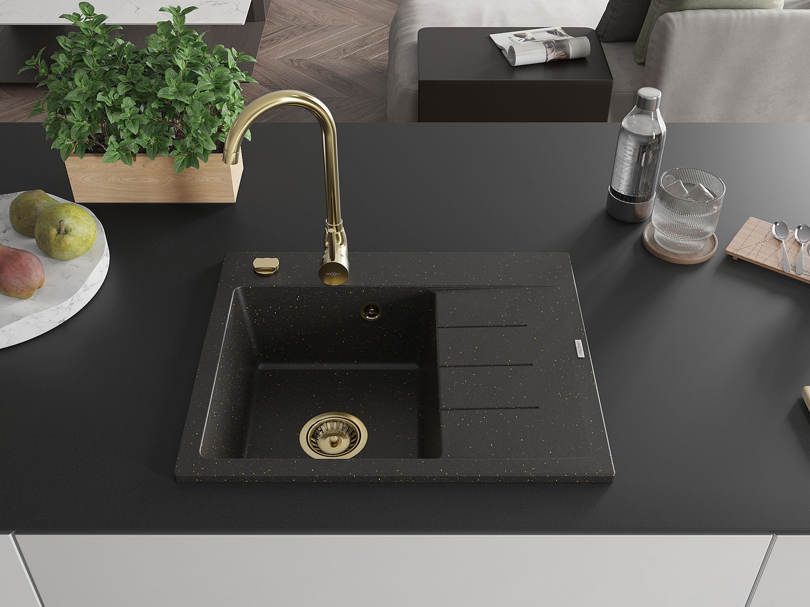Mexen Ben Évier en granit 1 bac avec égouttoir, à gauche 600 x 500 mm, noir/doré métallisé, siphon doré - 6522605000-75-G