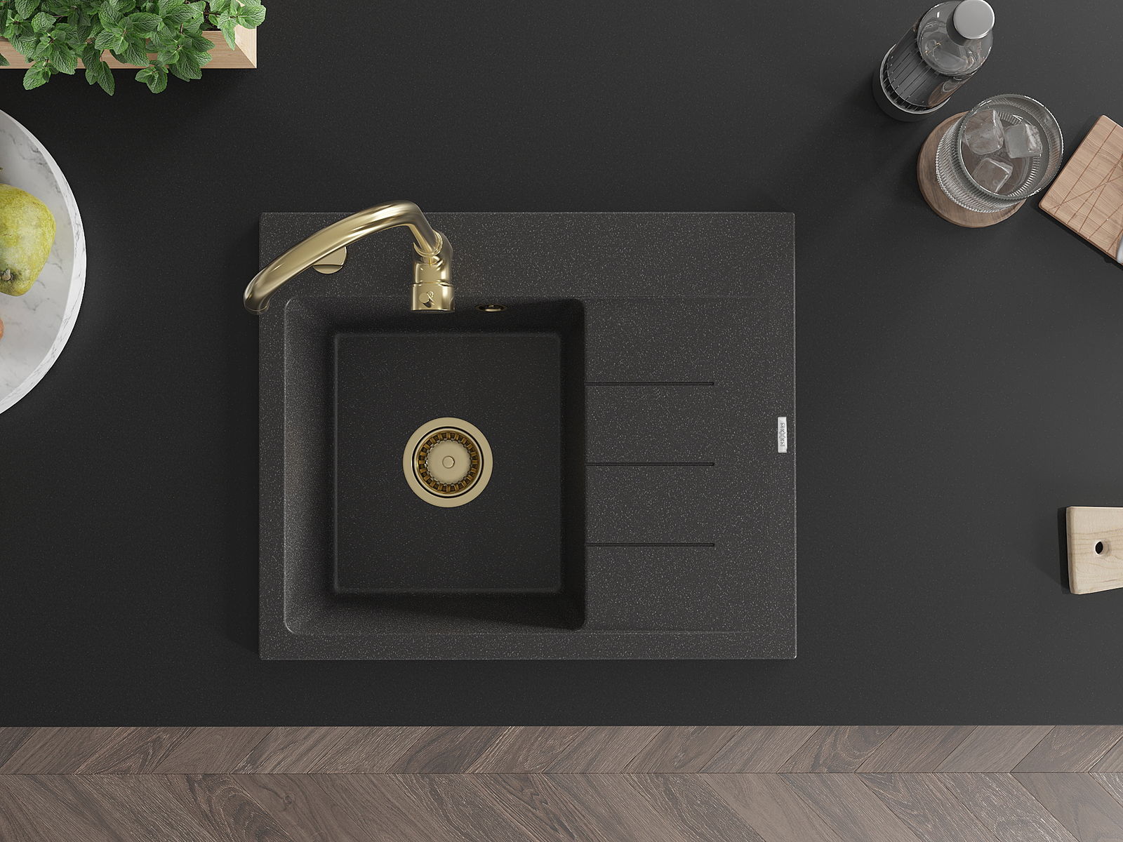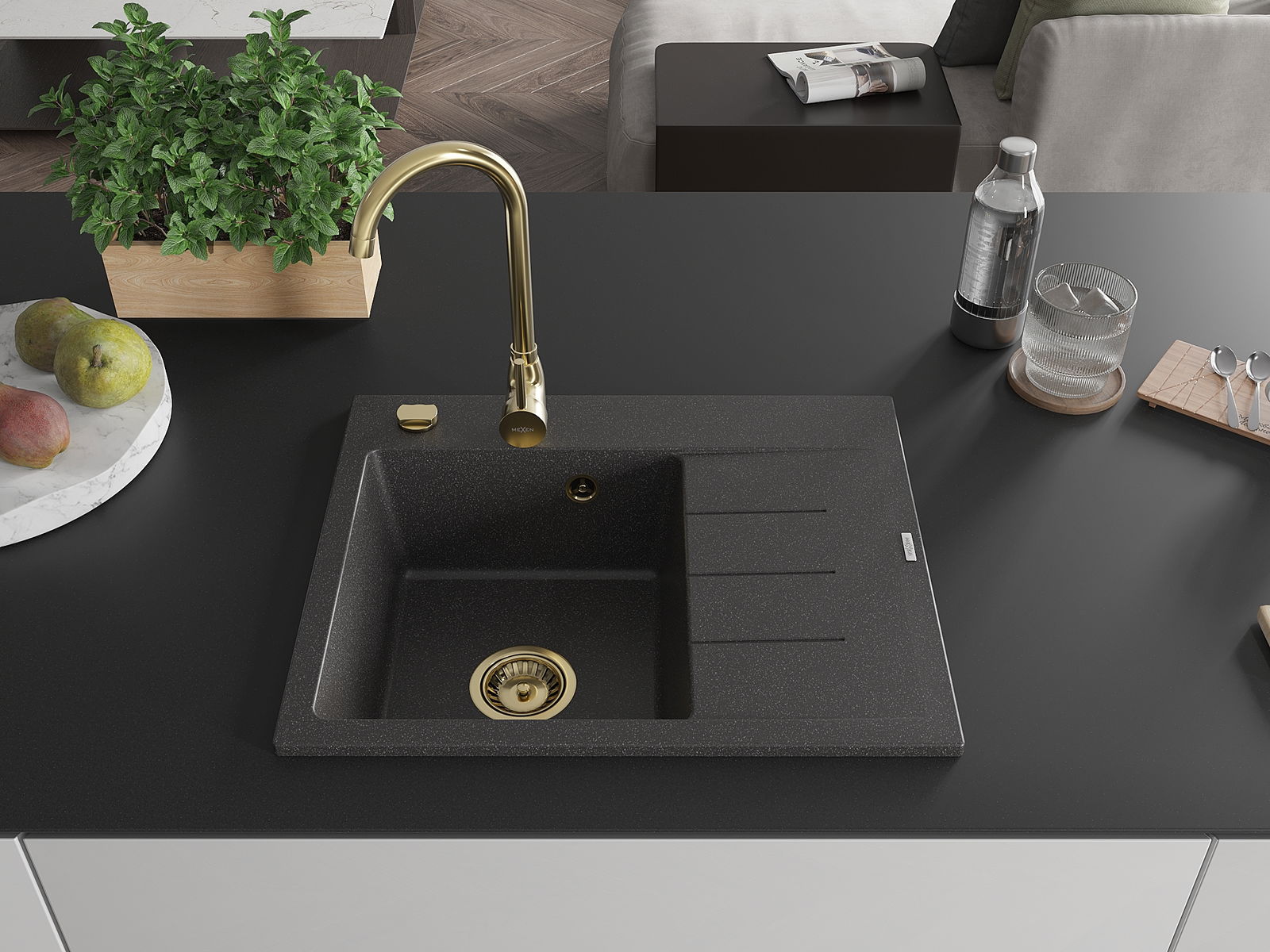 Mexen Ben évier en granit à 1 bac avec égouttoir, gauche 600 x 500 mm, noir moucheté, siphon doré - 6522605000-76-G