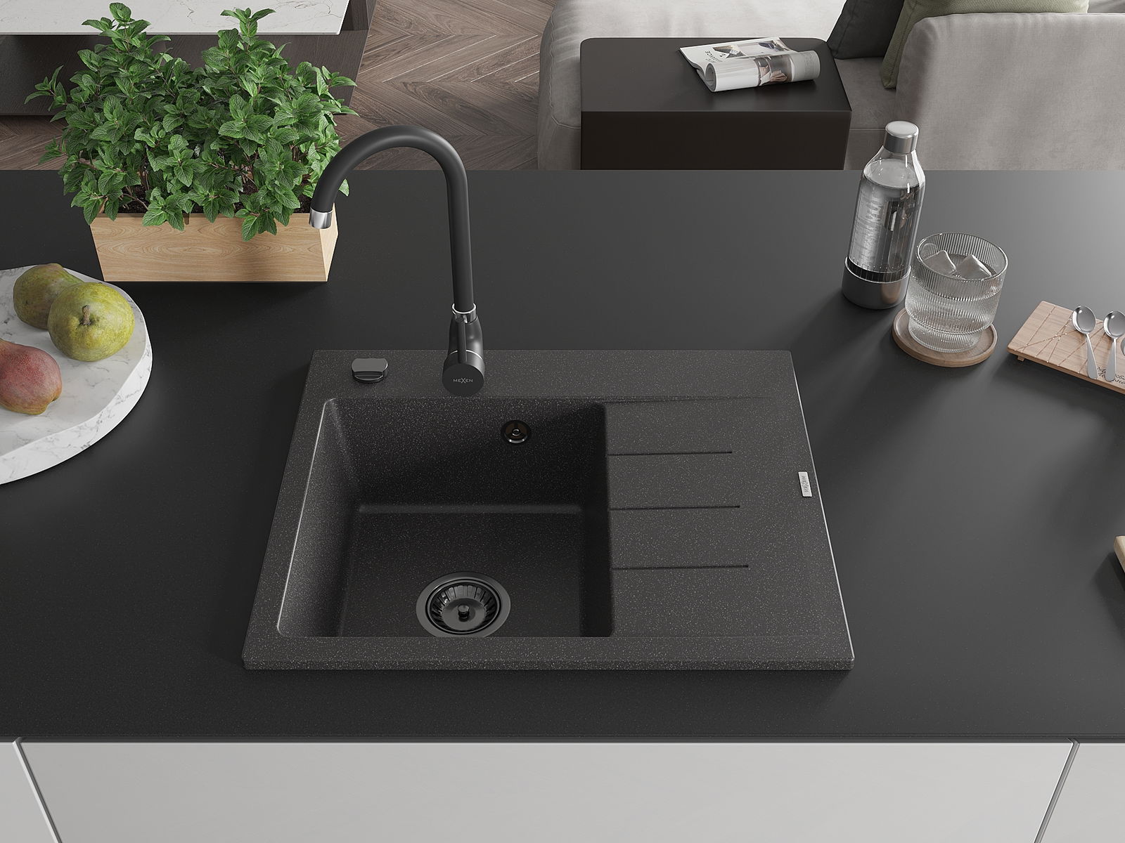 Mexen Ben évier granit 1 bac avec égouttoir gauche 600 x 500 mm, noir moucheté, siphon noir - 6522605000-76-B