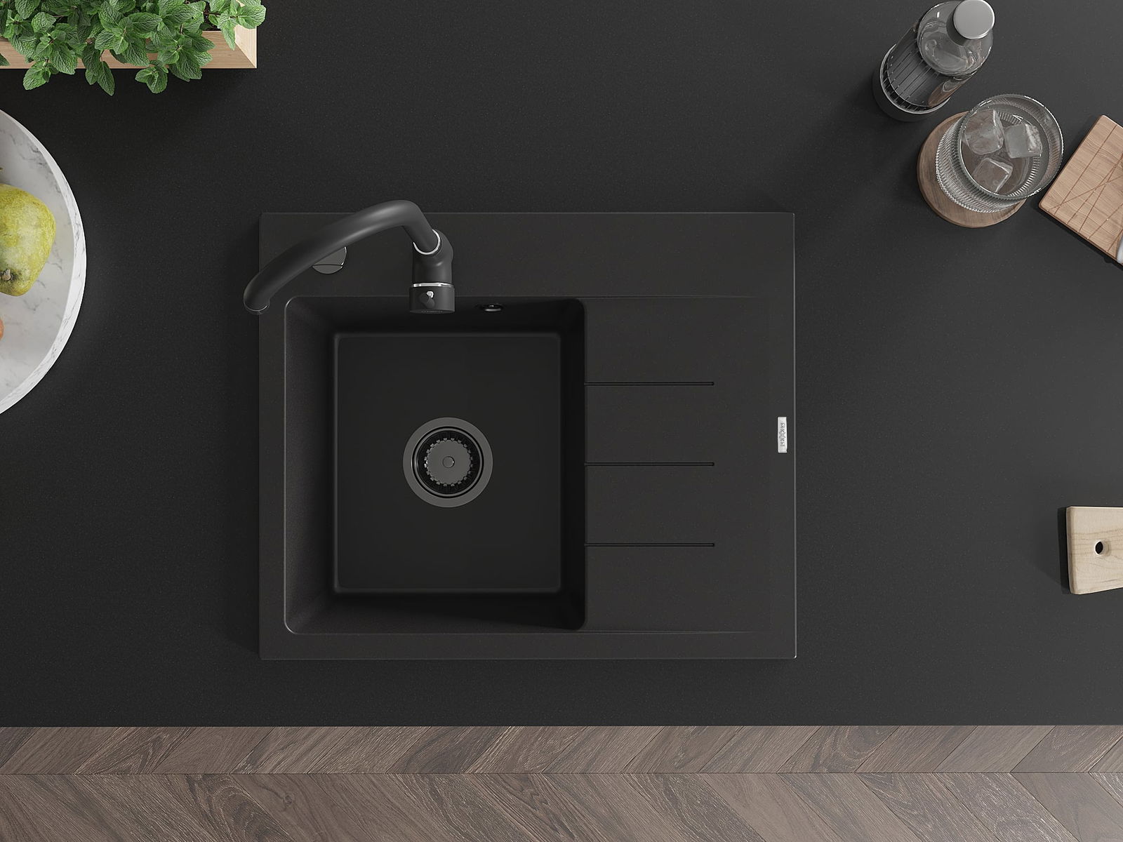 Mexen Ben évier en granit 1 bac avec égouttoir, gauche 600 x 500 mm, noir, siphon noir - 6522605000-77-B