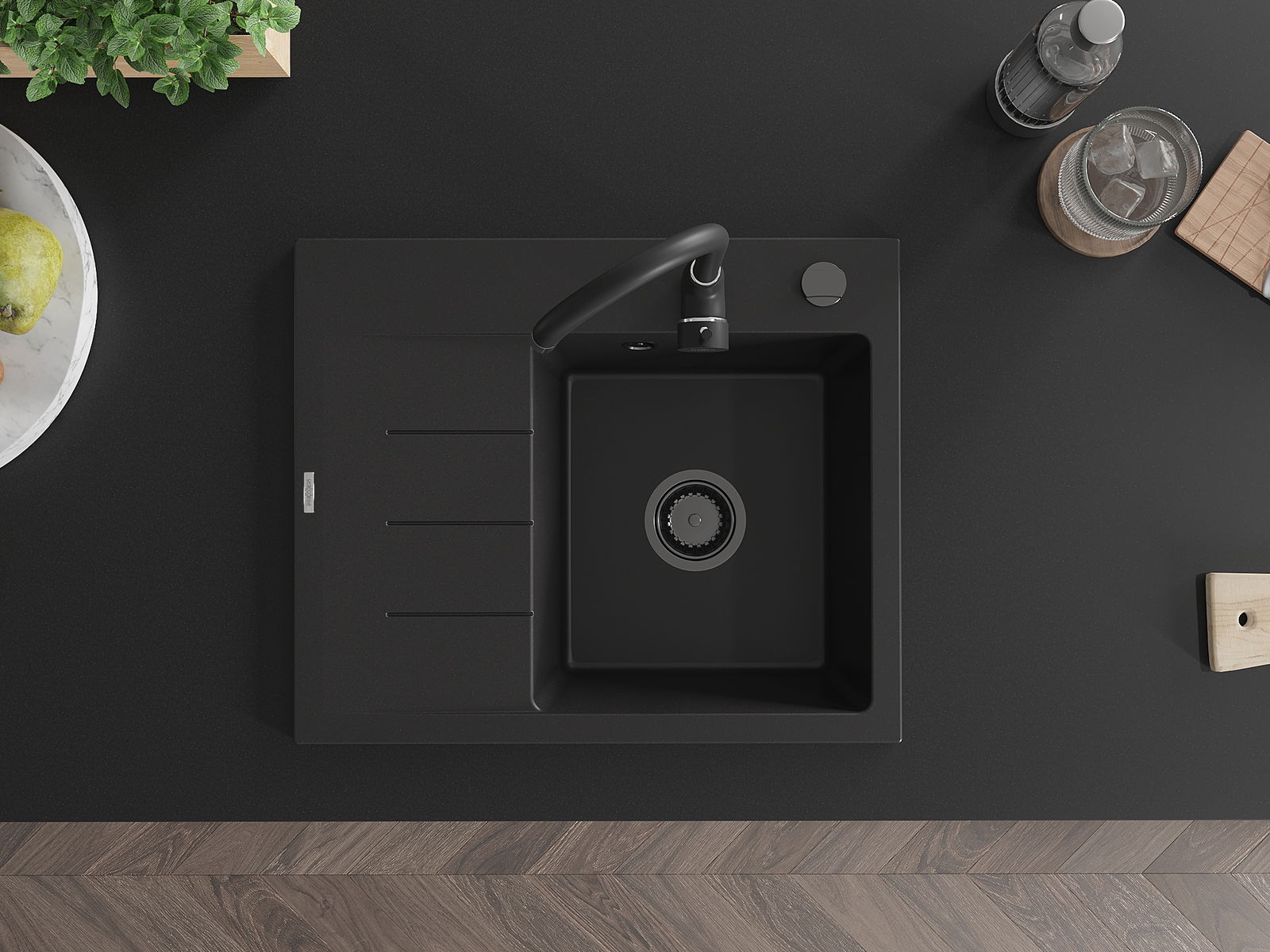 Mexen Ben évier en granit à 1 bac avec égouttoir, droit 600 x 500 mm, noir, siphon noir - 6523605000-77-B
