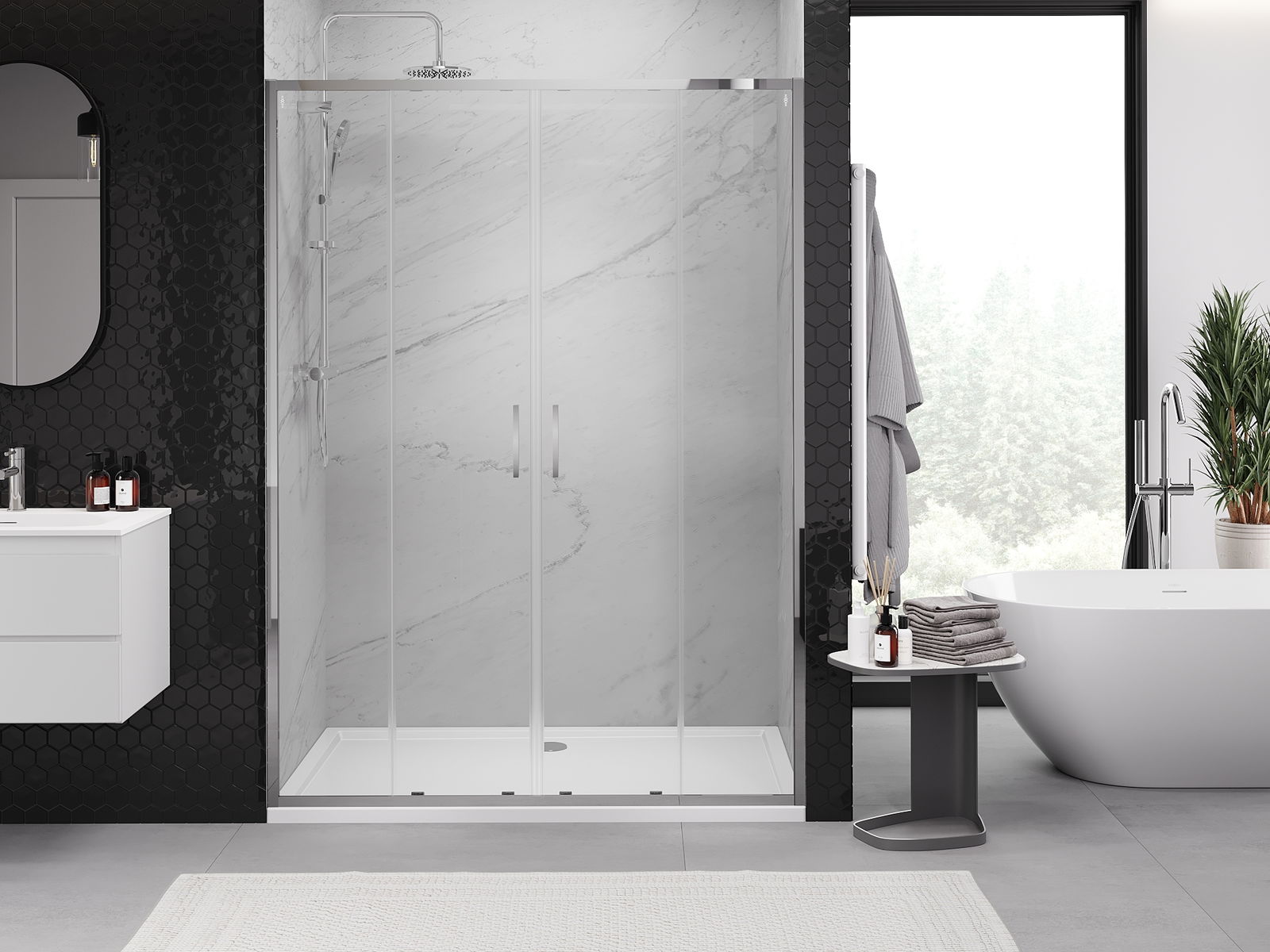 La poignée pratique et confortable est fabriquée en métal durable et résistant. Sa forme à la mode, combinée à une finition assortie à la couleur des profilés, donne à l'ensemble un aspect moderne et stylé, soulignant l'esthétique de chaque salle de bain.