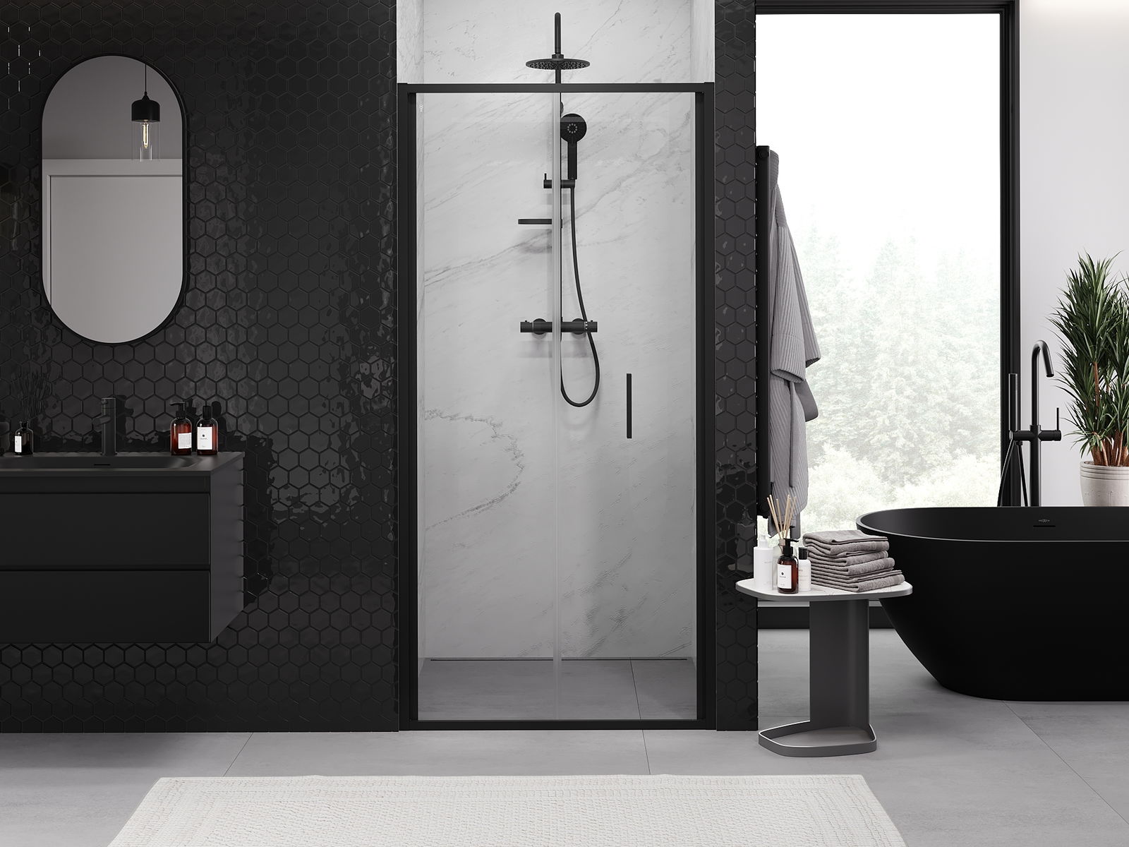 La poignée pratique et confortable est fabriquée en métal durable et résistant. Sa forme à la mode, combinée à une finition assortie à la couleur des profilés, donne à l'ensemble un aspect moderne et stylé, soulignant l'esthétique de chaque salle de bain.