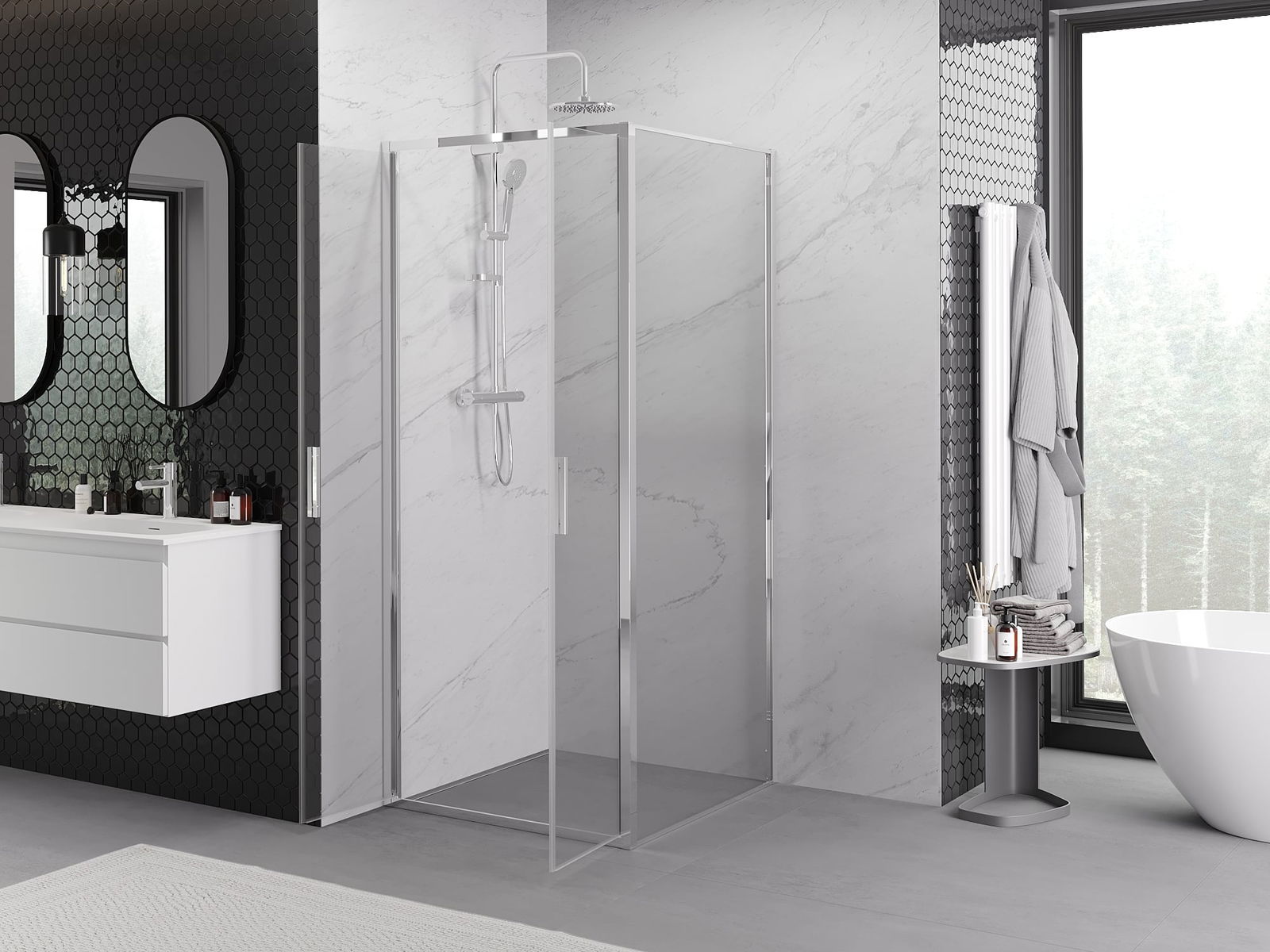 La poignée pratique et confortable est fabriquée en métal durable et résistant. Sa forme à la mode, combinée à une finition assortie à la couleur des profilés, donne à l'ensemble un aspect moderne et stylé, soulignant l'esthétique de chaque salle de bain.