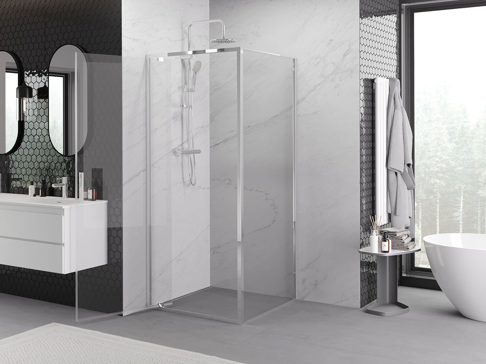 La poignée pratique et confortable est fabriquée en métal durable et résistant. Sa forme à la mode, combinée à une finition assortie à la couleur des profilés, donne à l'ensemble un aspect moderne et stylé, soulignant l'esthétique de chaque salle de bain.